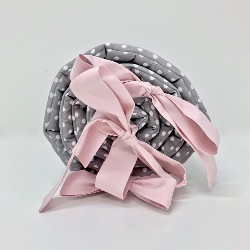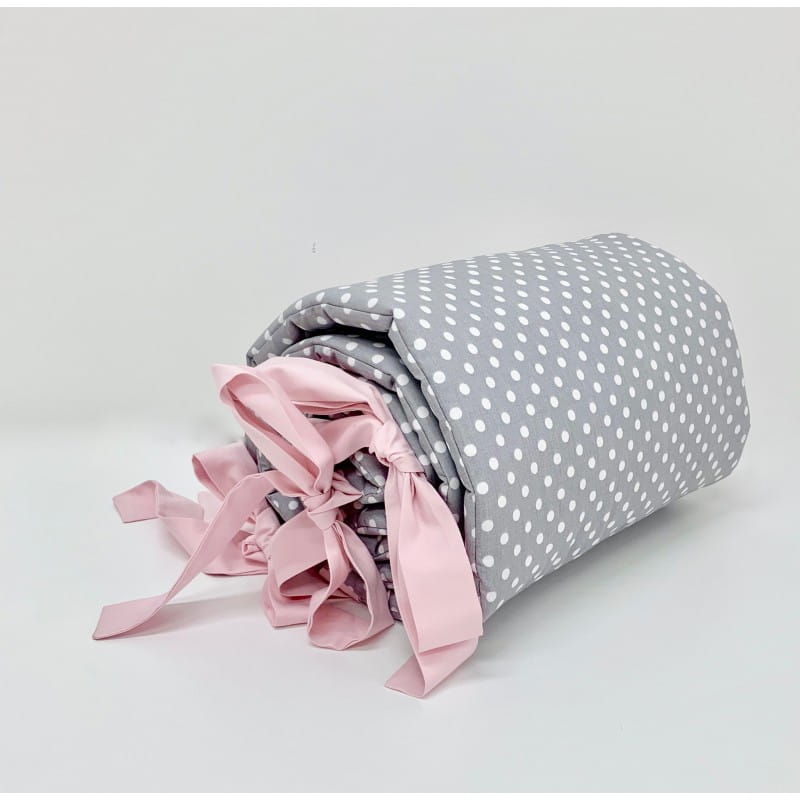 Ochraniacz został wykonany ze 100% bawełny w kolorze szarym, z motywem białych kropeczek o wielkości 4mm.