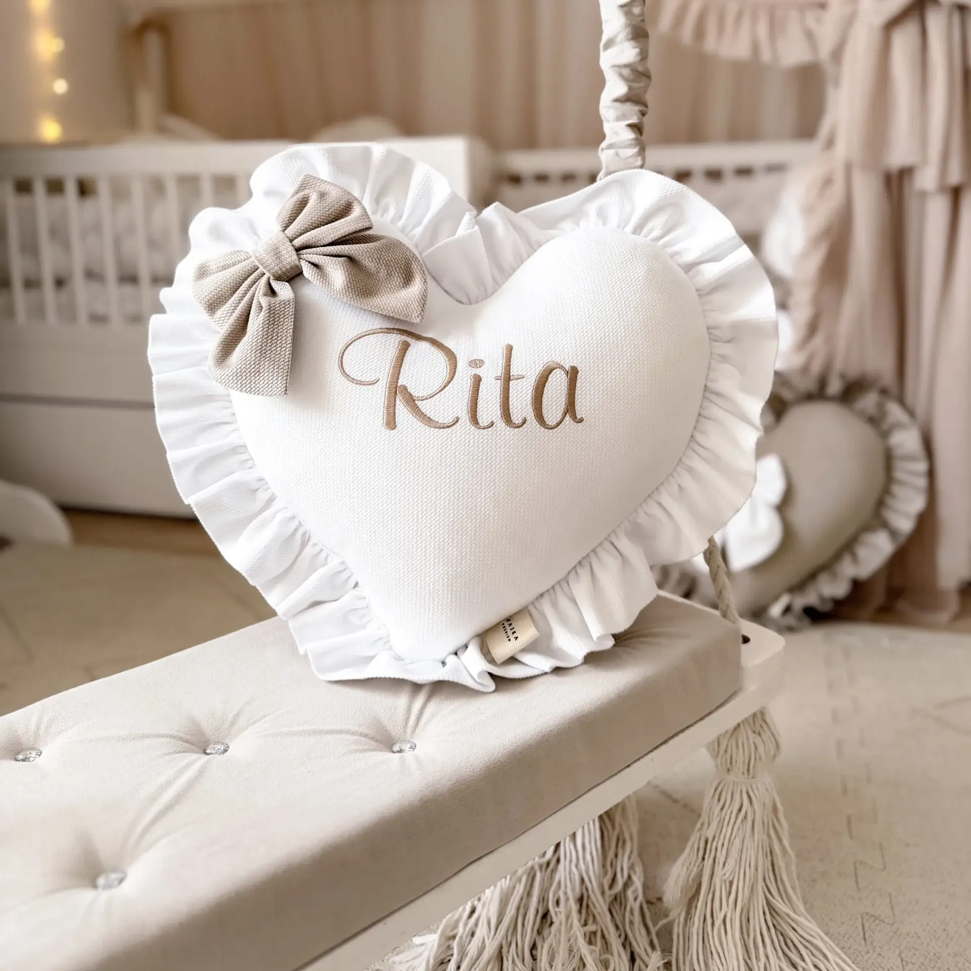Personalizowana poduszka w kształcie serca z miękkiego velvetu to urocza dekoracja do pokoju dziecka. Ozdobna falbanka, kokardka i haft z imieniem tworzą wyjątkową pamiątkę oraz idealny pomysł na prezent z okazji narodzin lub baby shower.