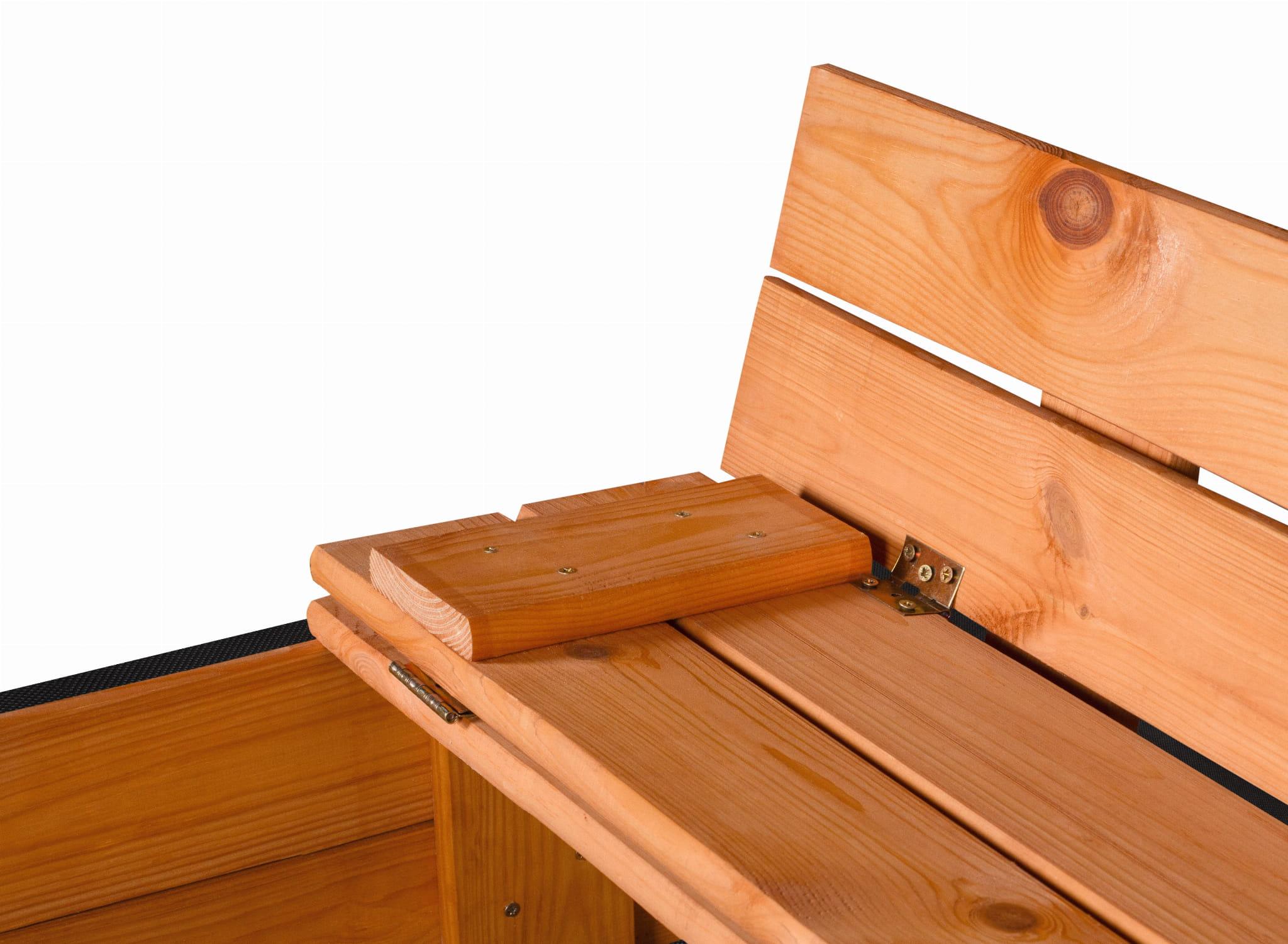 Praktyczne składane ławeczki to jedno z najbardziej funkcjonalnych rozwiązań w tej piaskownicy. Podczas zabawy pełnią rolę wygodnych siedzisk dla dzieci, natomiast po zakończeniu zabawy można je łatwo złożyć, tworząc pokrywę chroniącą piasek przed zabrudzeniami, liśćmi czy zwierzętami.