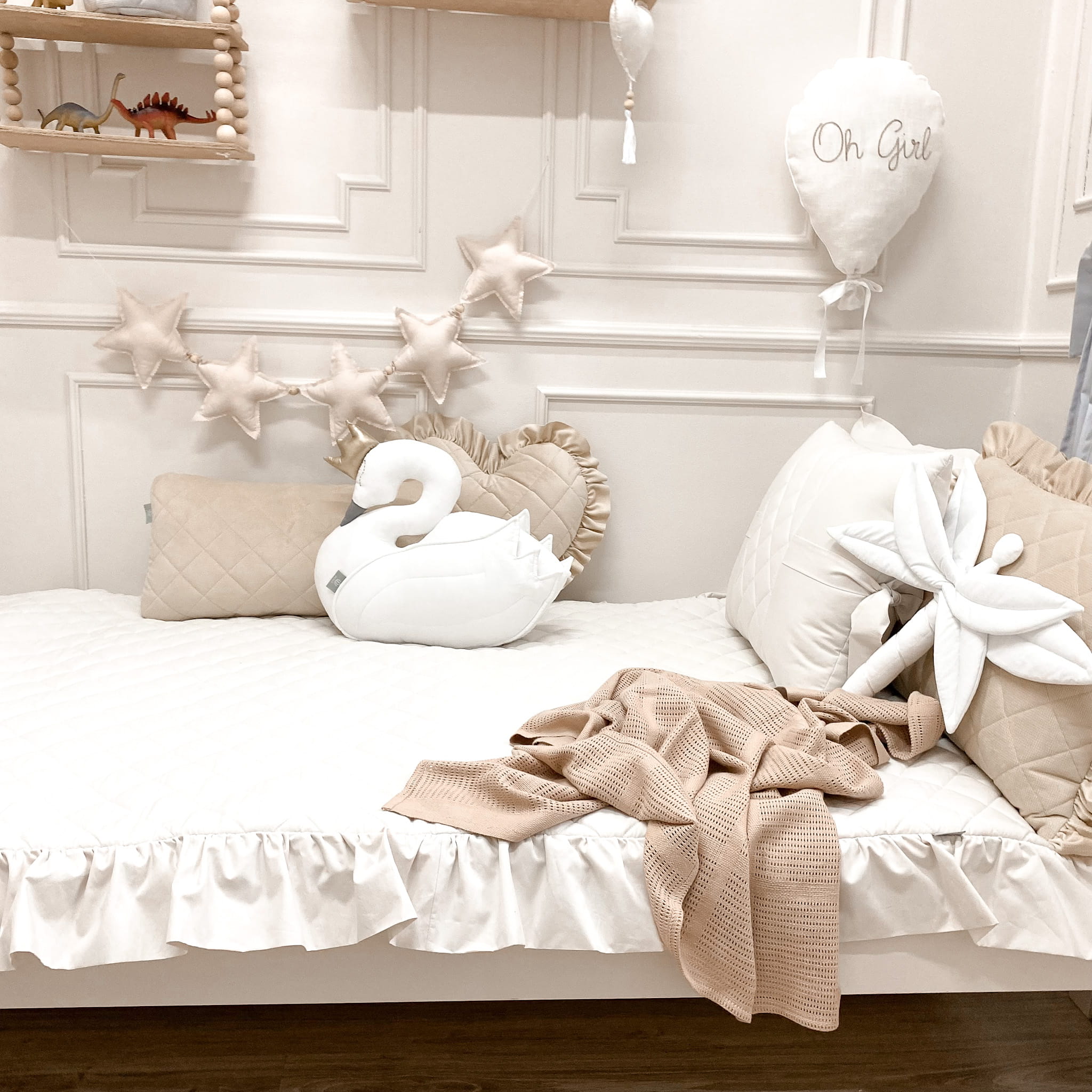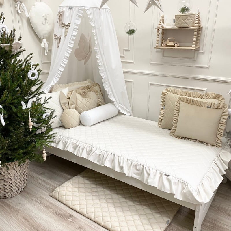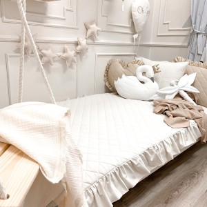 Boki narzuty zostały starannie wykończone dekoracyjną falbanką, która dodaje całości subtelnego, dziecięcego uroku. Pikowana narzuta doskonale chroni pościel przed kurzem i zabrudzeniami, pomagając zachować porządek w łóżeczku zarówno w ciągu dnia, jak i podczas drzemek. Jest to idealne rozwiązanie dla rodziców ceniących estetykę, funkcjonalność i wysoką jakość wykonania.