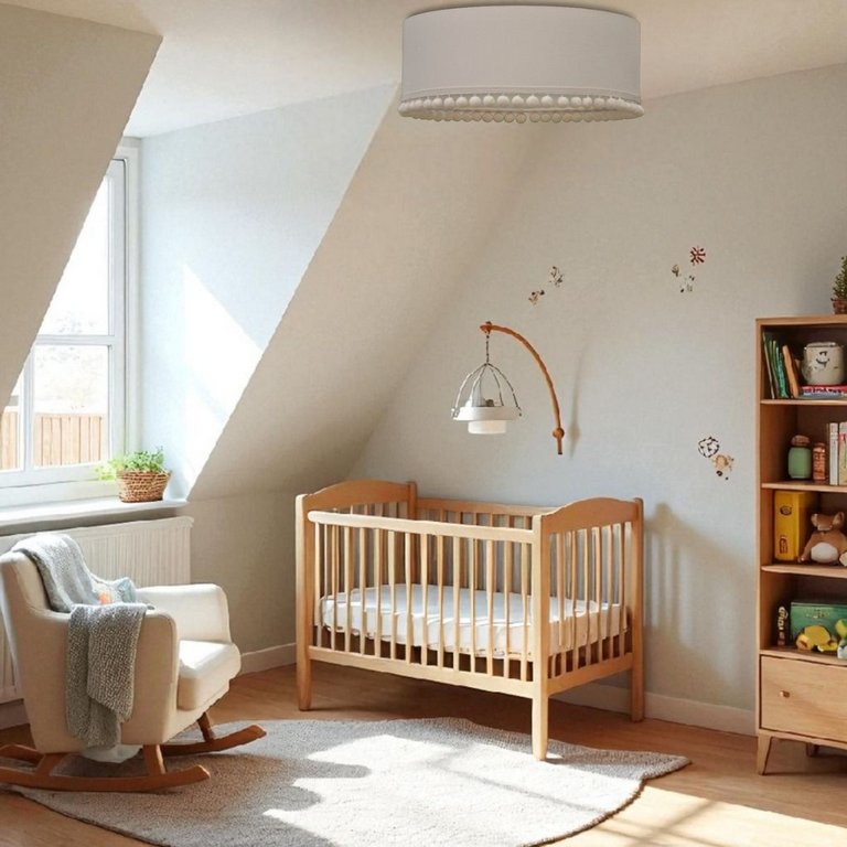Elegancki plafon w kolorze kremowym z ozdobnymi pomponikami — delikatny element dekoracyjny idealny do pokoju dziecięcego lub strefy wypoczynku. Neutralny design, który pasuje do wielu stylów wnętrz.
