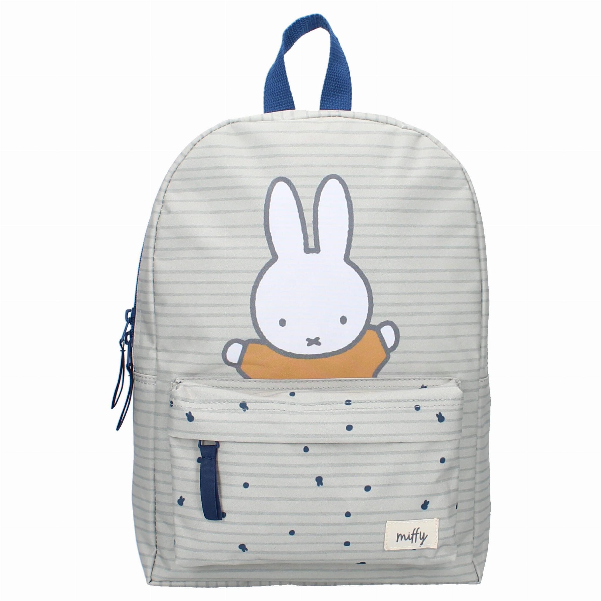 Ten uroczy, elegancki jasno szary plecak w delikatne paski z niebieskim wykończeniem jest idealny dla małych poszukiwaczy przygód i fanów króliczki Miffy, bohaterki bajek i kiążeczek. Plecak wykonany jest z wysokiej jakości poliestru z satynowym wykończeniem, w kolorze szarym z ozdobnymi obrazkami króliczki Miffy.
