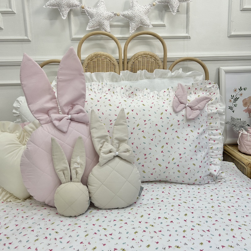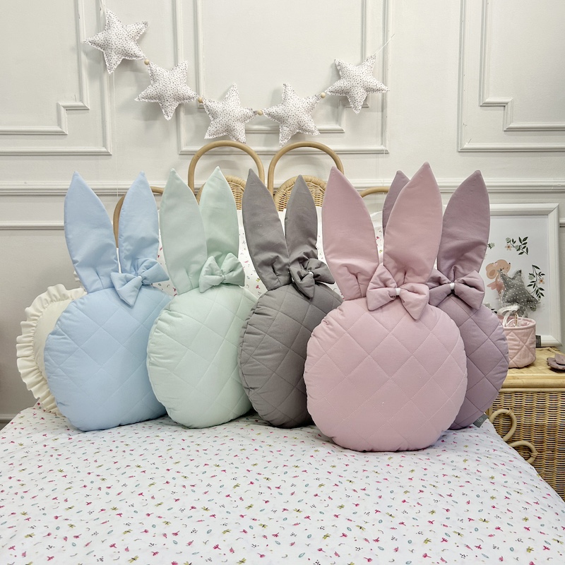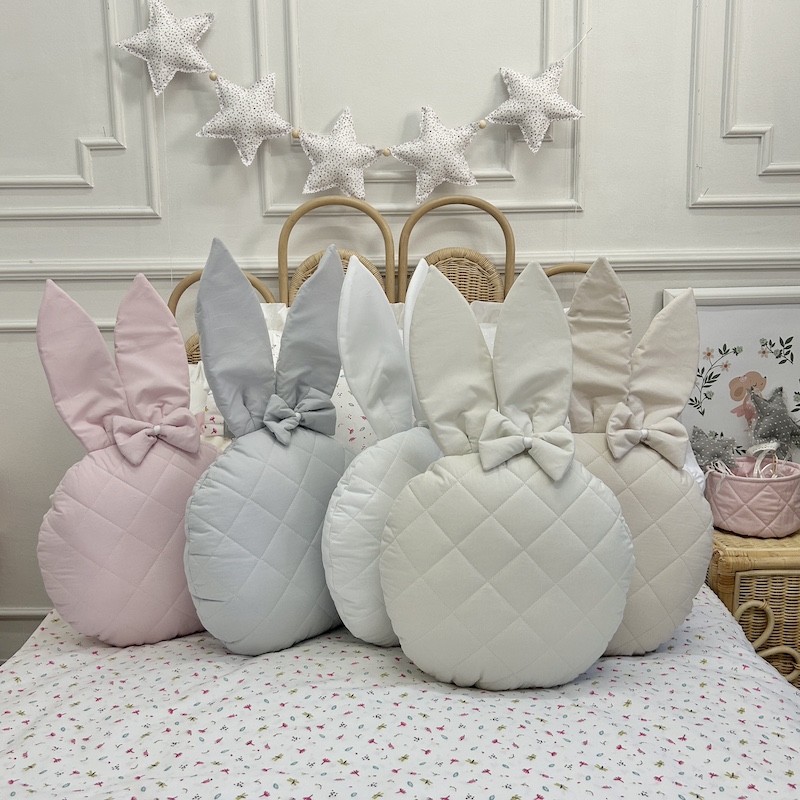 Poduszka dekoracyjna Króliczek L z pikowaną buźką i długimi uszami. Największy rozmiar w kolekcji – buźka 34 cm, uszy 24 cm. Uszyta z 100% bawełny, wypełniona kulką silikonową. Możliwość personalizacji.