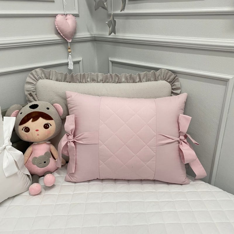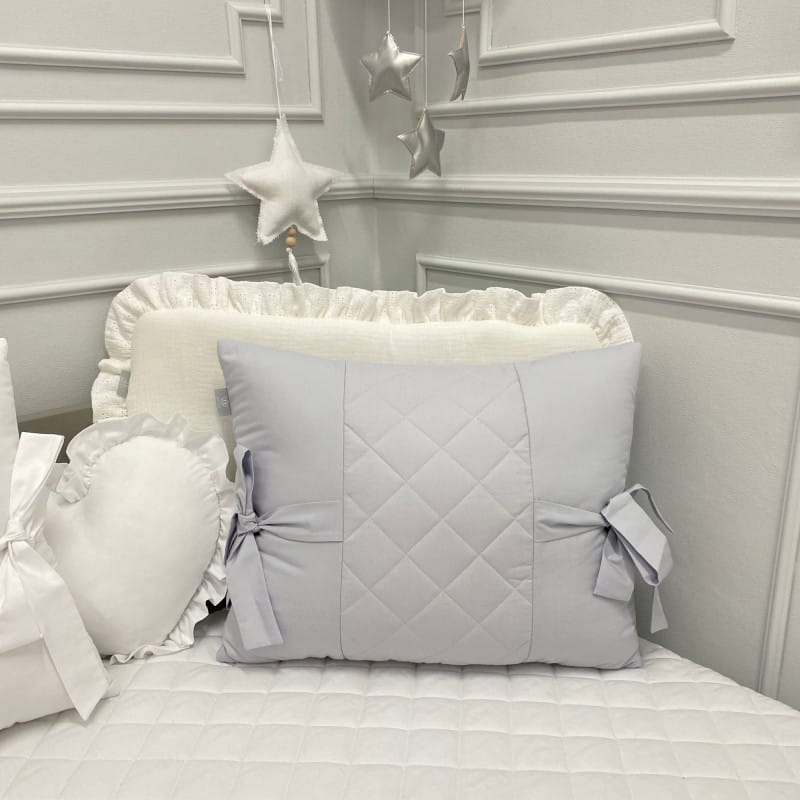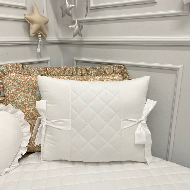 Pikowana Poduszka z Kokardami 37 x 48 cm, 100% certyfikowana bawełna satynowa, wypełnienie kulką silikonową. Elegancka i miękka dekoracja do pokoju dziecka, salonu lub sypialni.