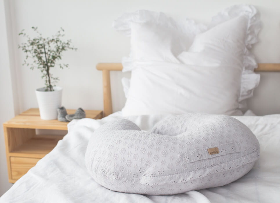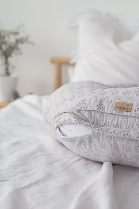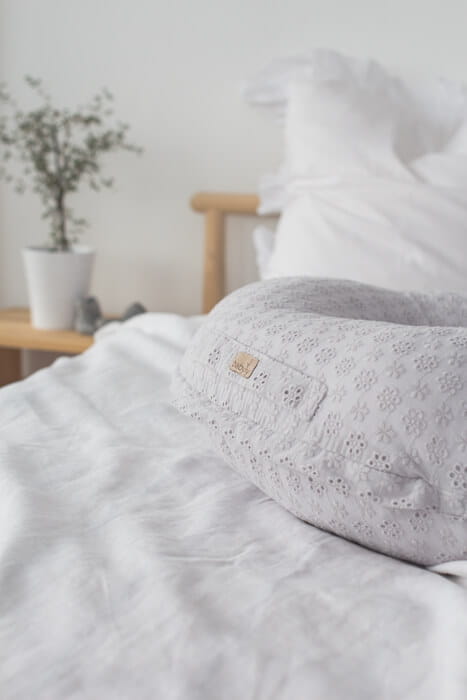 Poduszka do karmienia wykonana została z pięknej haftowanej bawełny. Poduszka w kształcie rogala ułatwia karmienie niemowlaka, odciąży plecy mamy. Może służyć mamie już w okresie ciąży jako podpórka pod brzuszek, głowę lub nogi. Niemowlakowi ułatwi jedzenie. Dzięki niej maluszek karmiony piersią może przybrać różne pozycje, co zapewni odpowiednie spijanie mleka. Poduszki można używać również w czasie leżakowania maluszka na brzuchu lub przy nauce samodzielnego siedzenia. Pokrowiec poduszki można z łatwością zdjąć co ułatwi pranie.