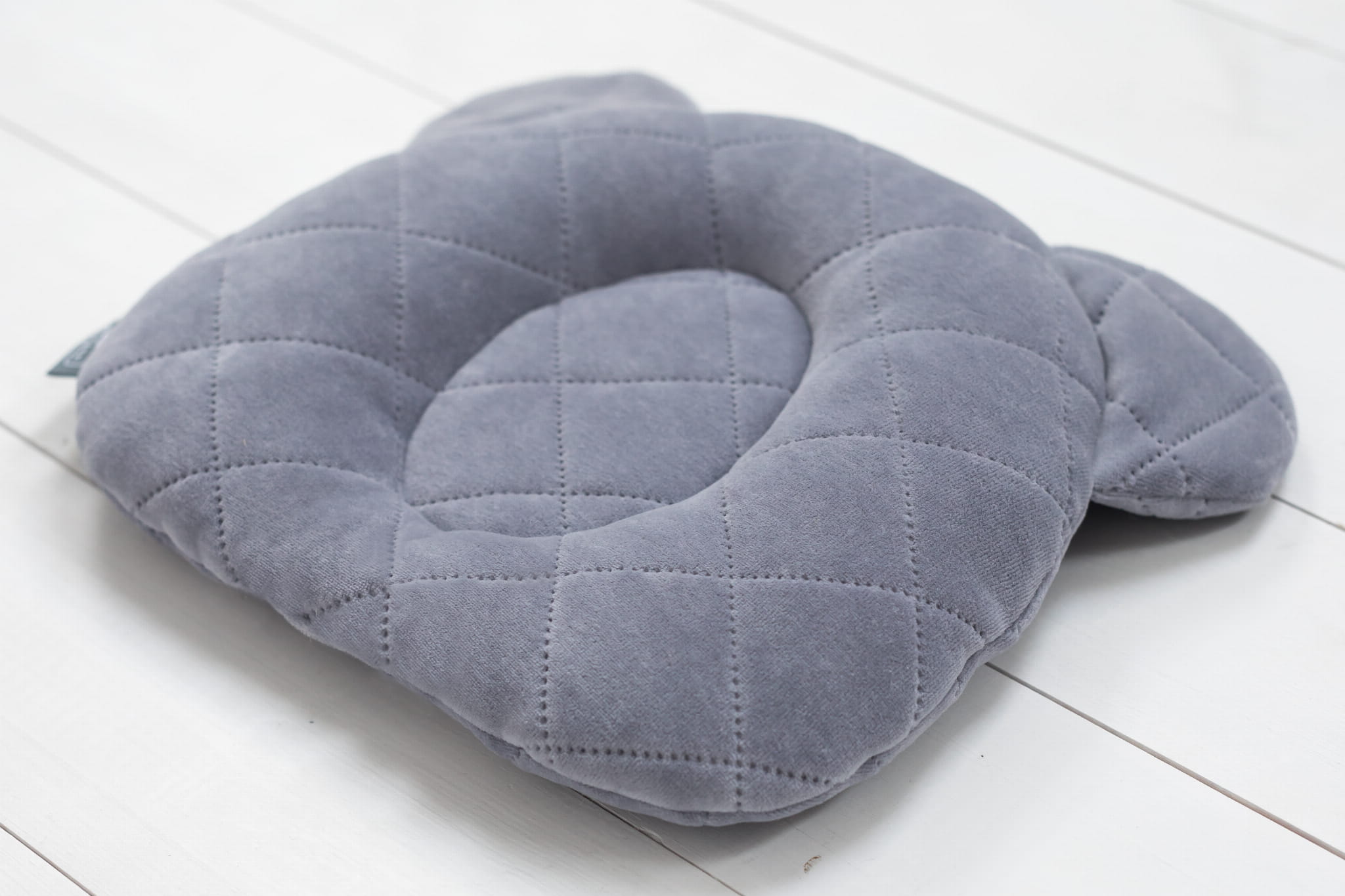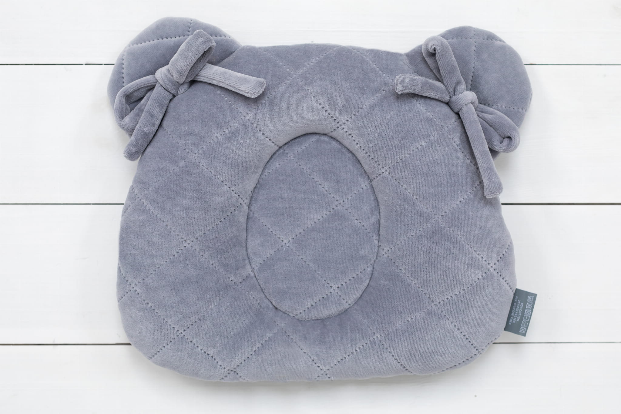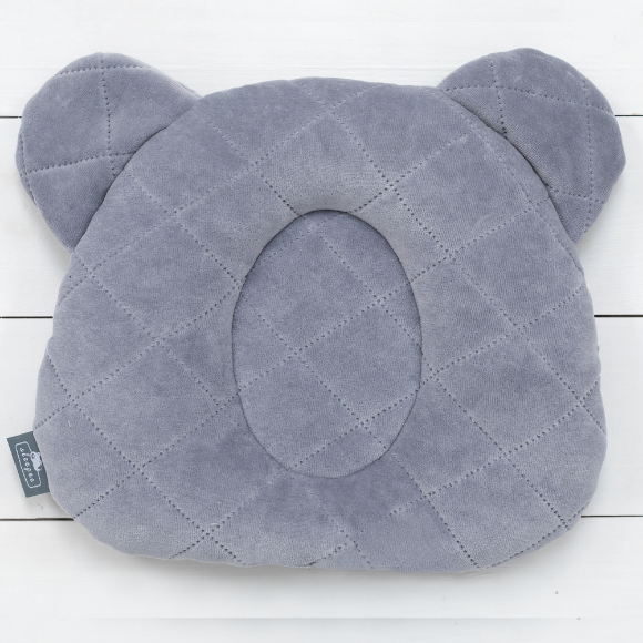 Poduszka ma kształt główki misia i wykonana jest z miękkiego, przyjemnego w dotyku weluru. Na środku znajduje się delikatne wgłębienie, które sprawia, że ciężar główki rozkłada się równomiernie, nie powodując nacisku w jednym miejscu.