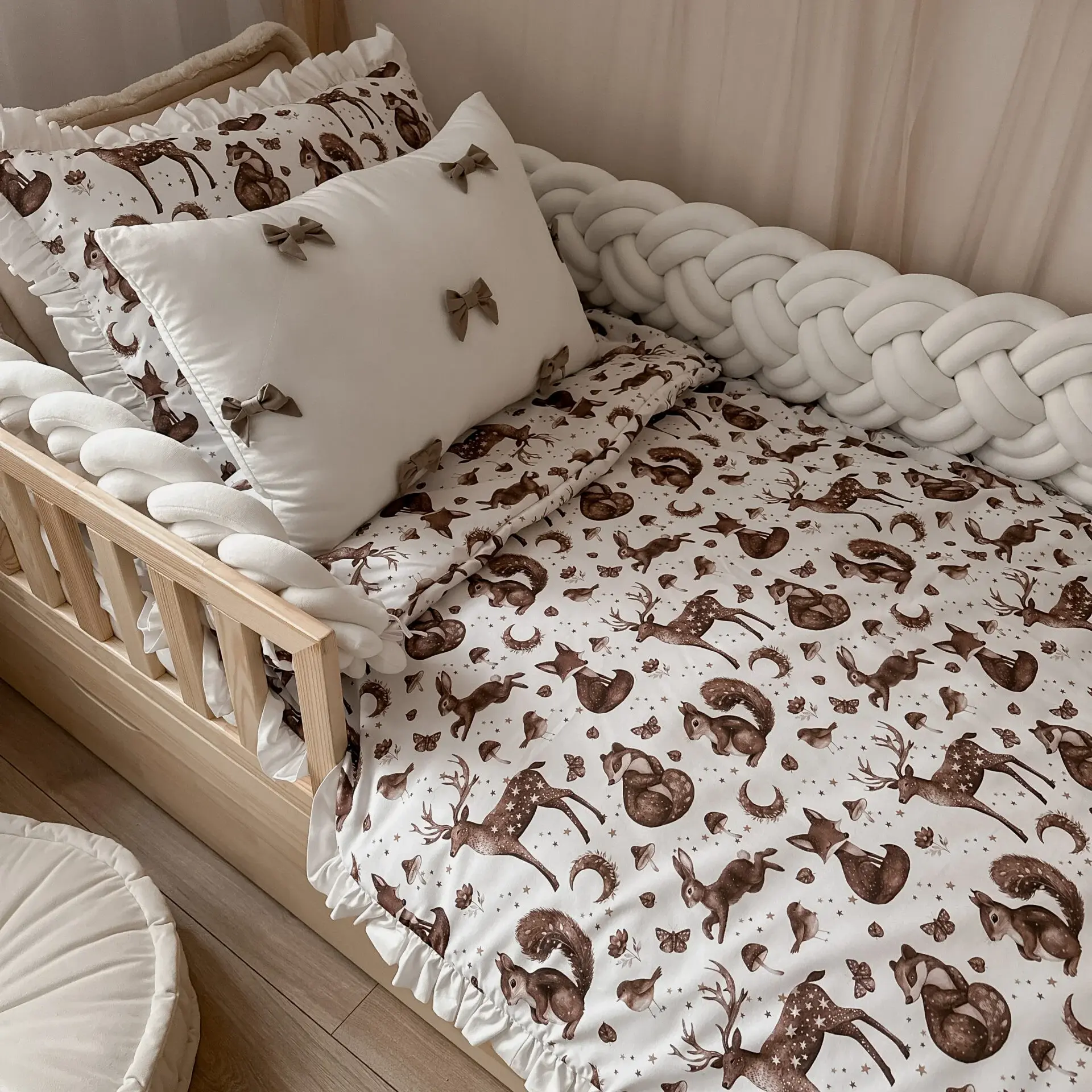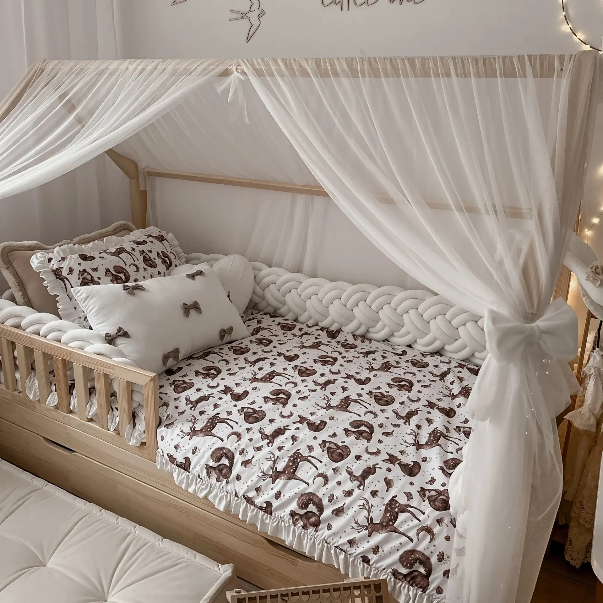 Poszewki dziecięce Gwiezdny Las z falbankami zostały uszyte z delikatnej i bezpiecznej dla skóry dziecka bawełny premium 100%. Subtelny, leśno-gwiezdny wzór w połączeniu z ozdobnymi falbankami tworzy przytulną i elegancką aranżację dziecięcego łóżka. Poszewki zapinane są na wygodny suwak, posiadają certyfikat Oeko-Tex Standard 100 i dostępne są w różnych rozmiarach – idealnych do łóżeczka niemowlęcego oraz łóżka starszego dziecka.