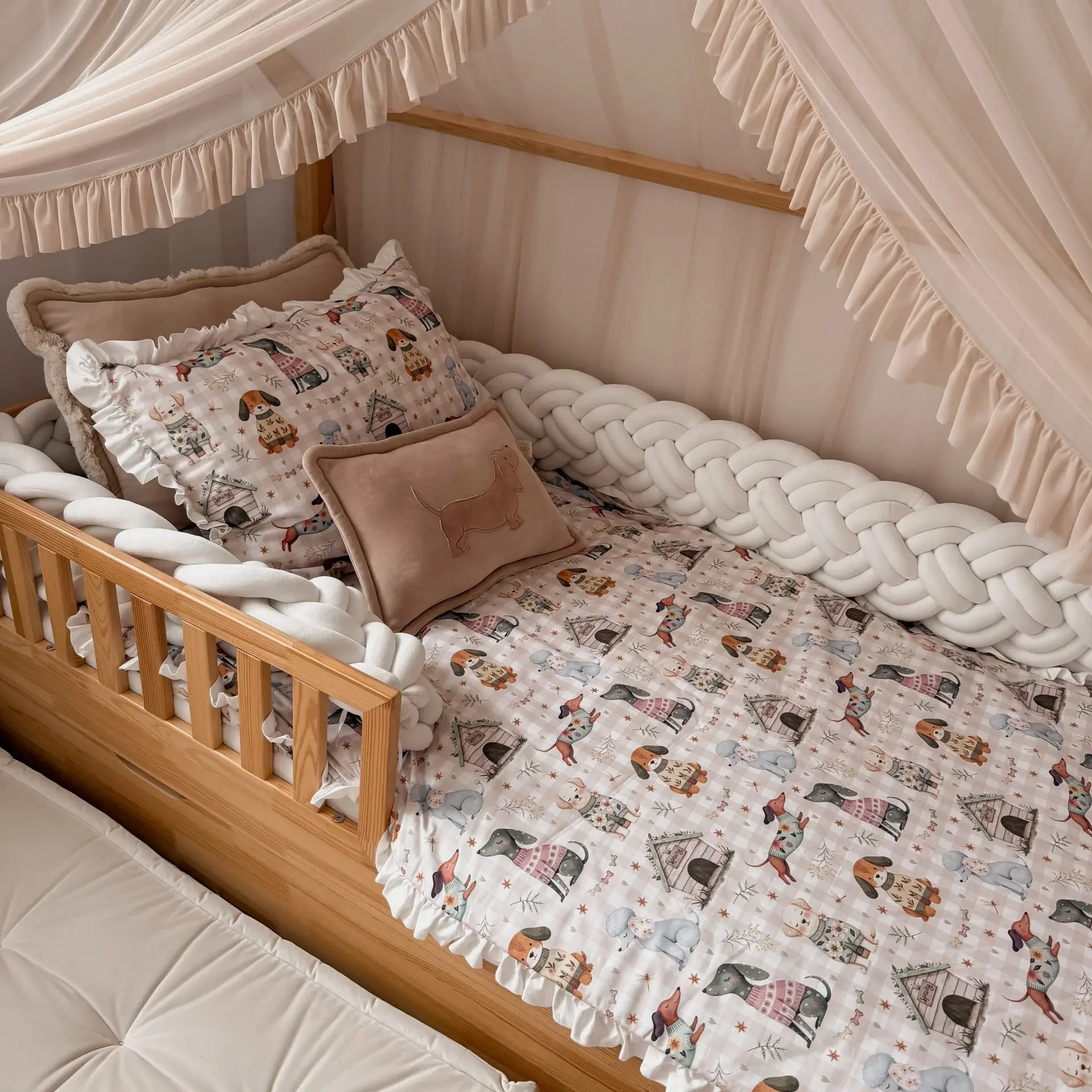 Pościel dziecięca Pieski to wyjątkowy komplet stworzony z myślą o spokojnym śnie, bezpieczeństwie oraz przytulnej aranżacji pokoju dziecka. Uszyta ręcznie z najwyższej jakości zmiękczanej bawełny premium 100%, zachwyca uroczym wzorem w pieski oraz subtelną, białą falbanką, która nadaje całości delikatny i ponadczasowy charakter.