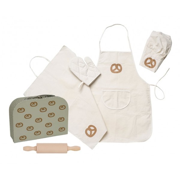 Zawartość zestawu: fartuch, czapka, rękawica, ściereczka, wałek do ciasta, torba do przechowywania