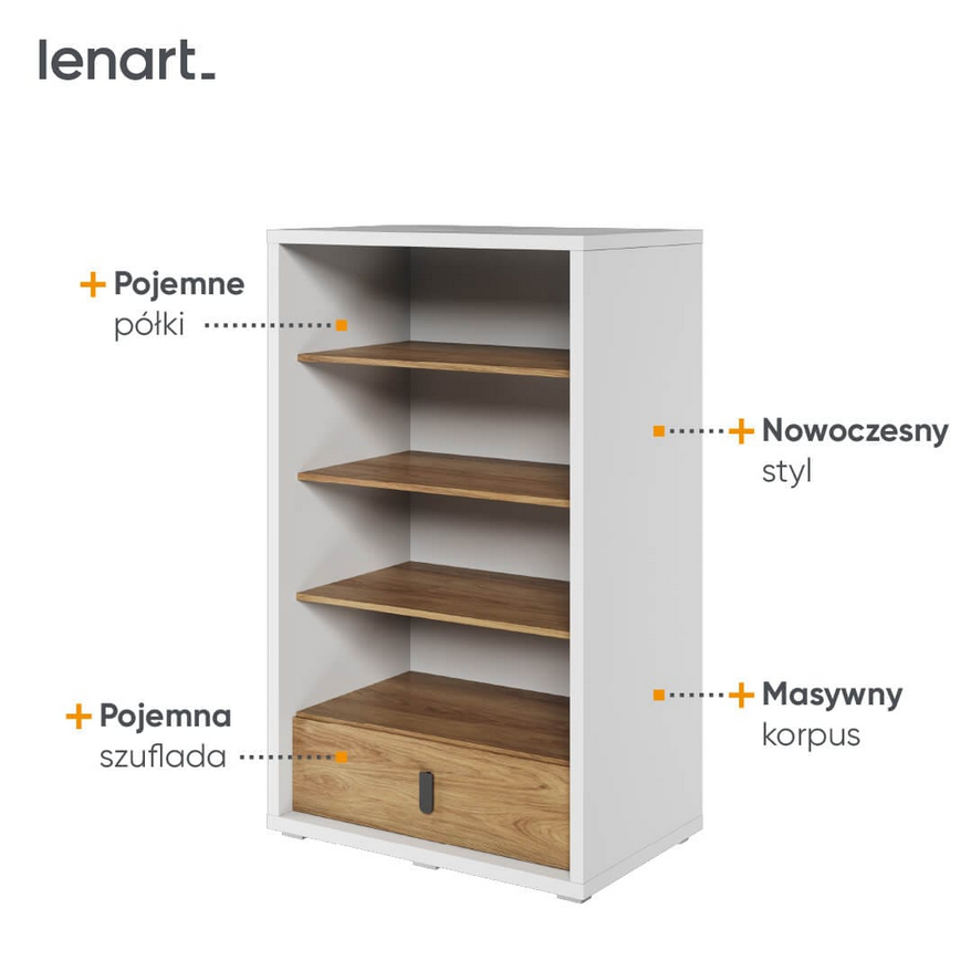 Regał młodzieżowy SIMI – niski regał z czterema półkami i dużą szufladą