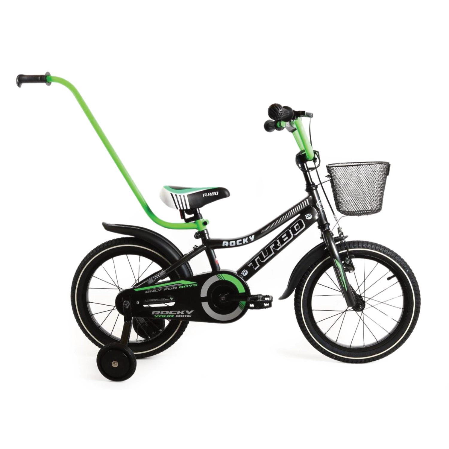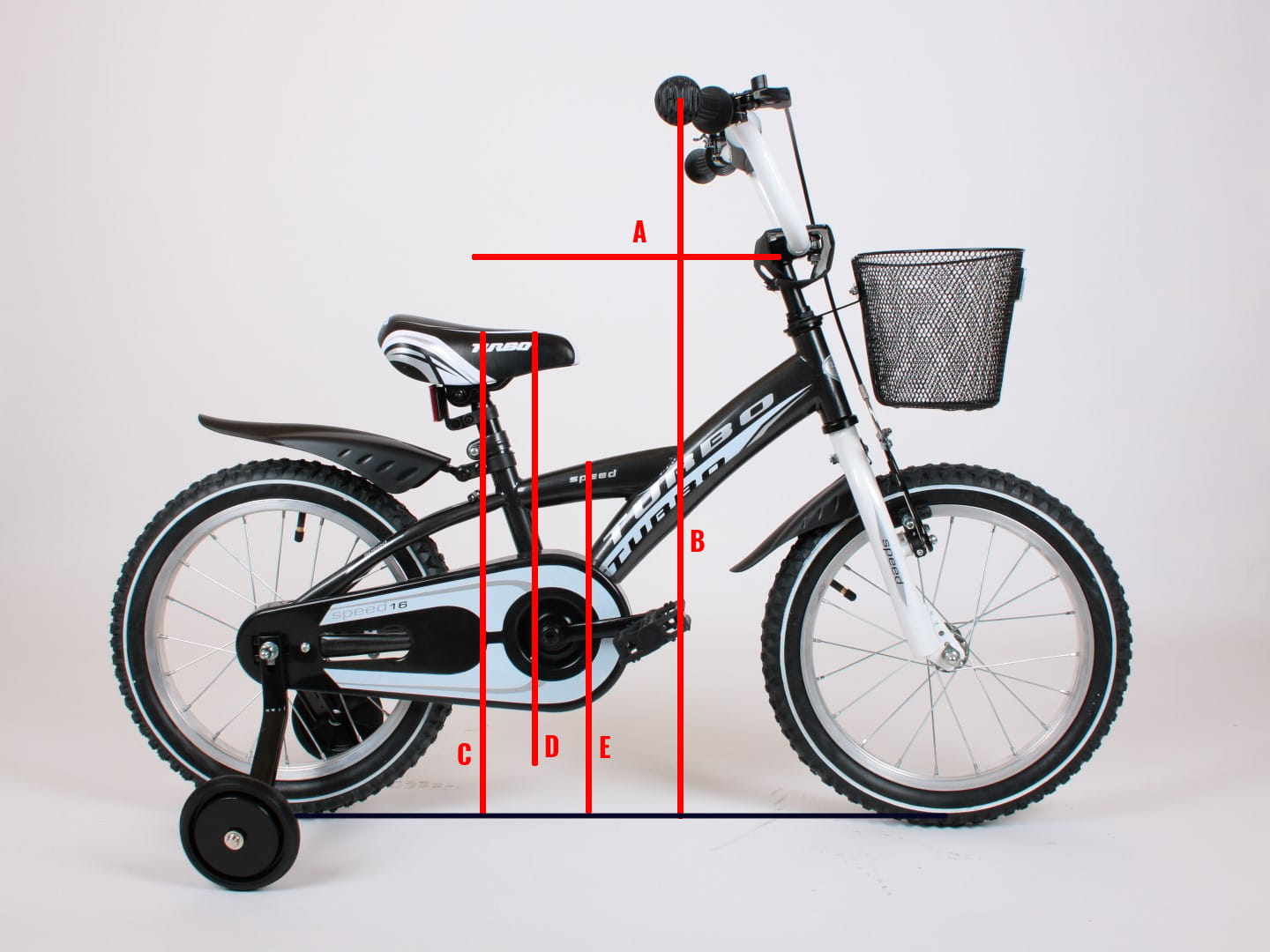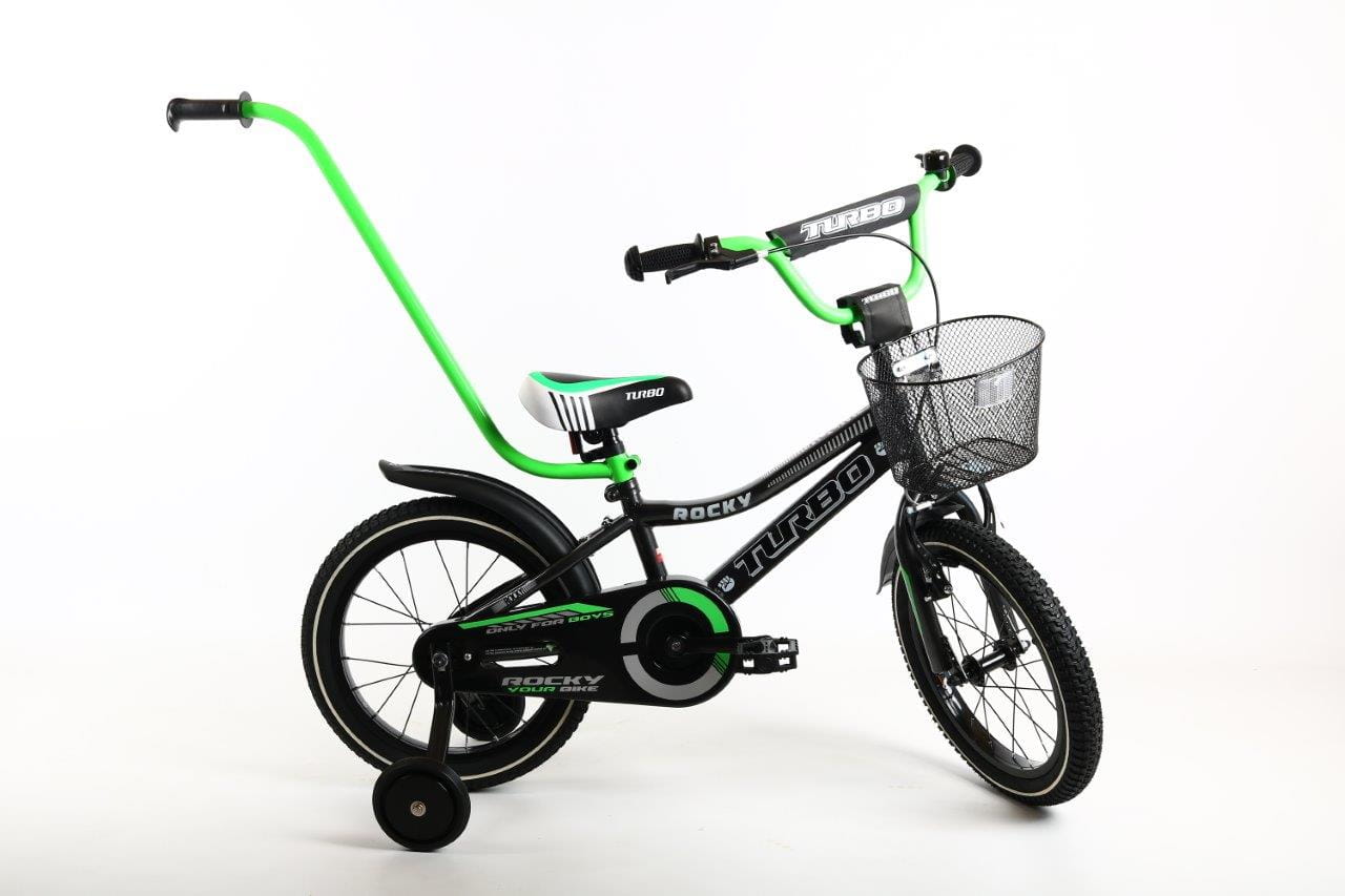 - Wyposażenie dodatkowe: Dzwonek, koszyk z przodu, kółka podporowe, drążek do prowadzenia.