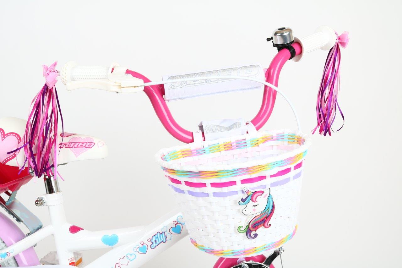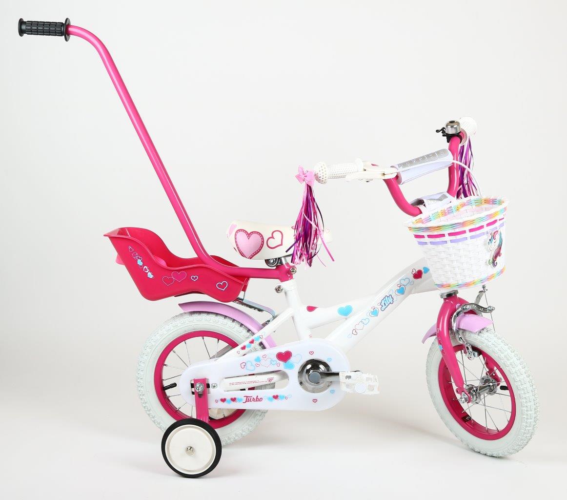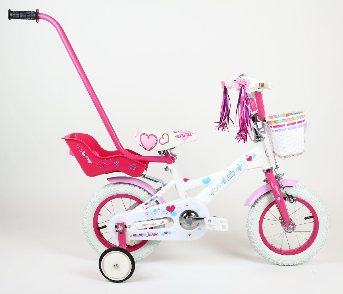 Wyposażenie dodatkowe - dzwonek, kółka podporowe, wstążki na kierownice, koszyk przód, fotelik dla lalek, uchwyt do prowadzenia