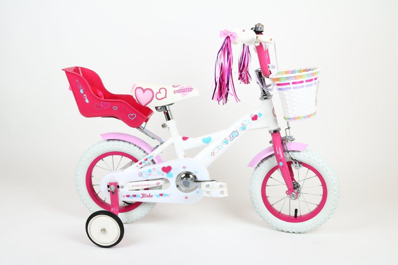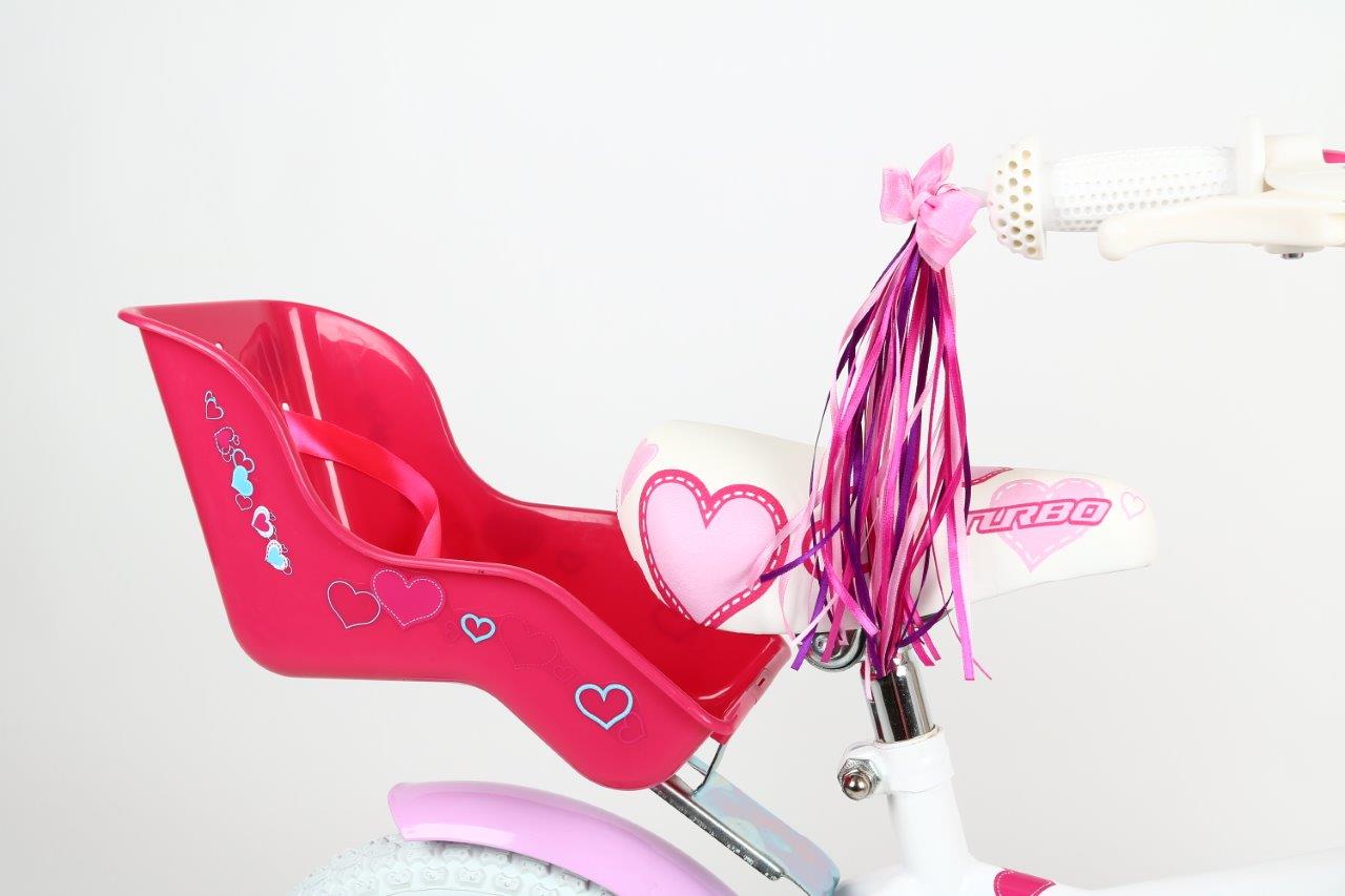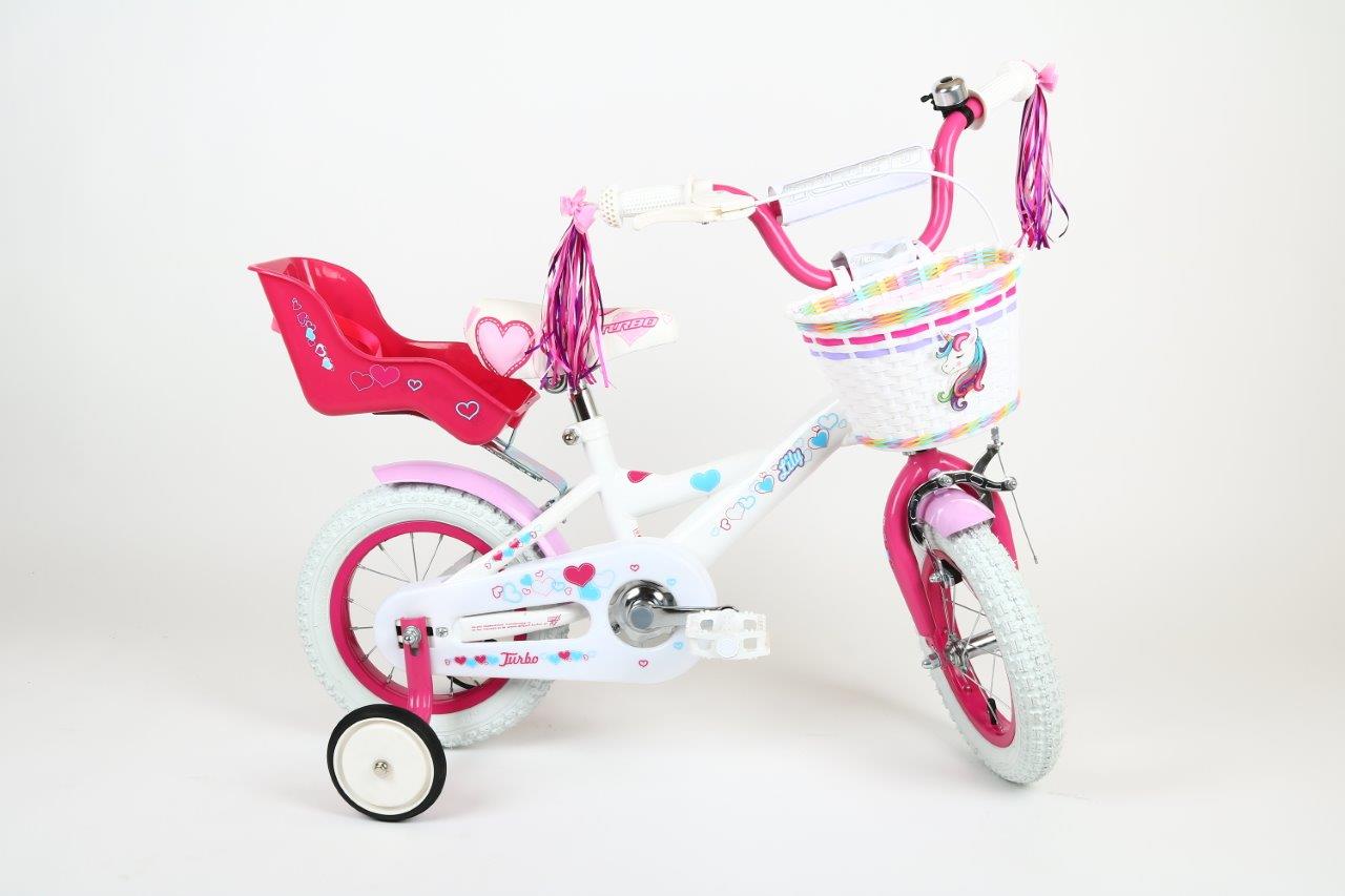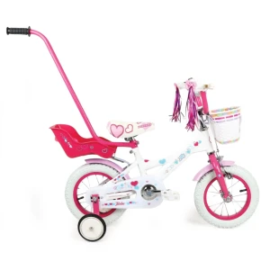 Wyposażenie dodatkowe - dzwonek, kółka podporowe, wstążki na kierownice, koszyk przód, fotelik dla lalek, uchwyt do prowadzenia