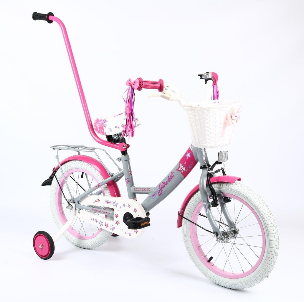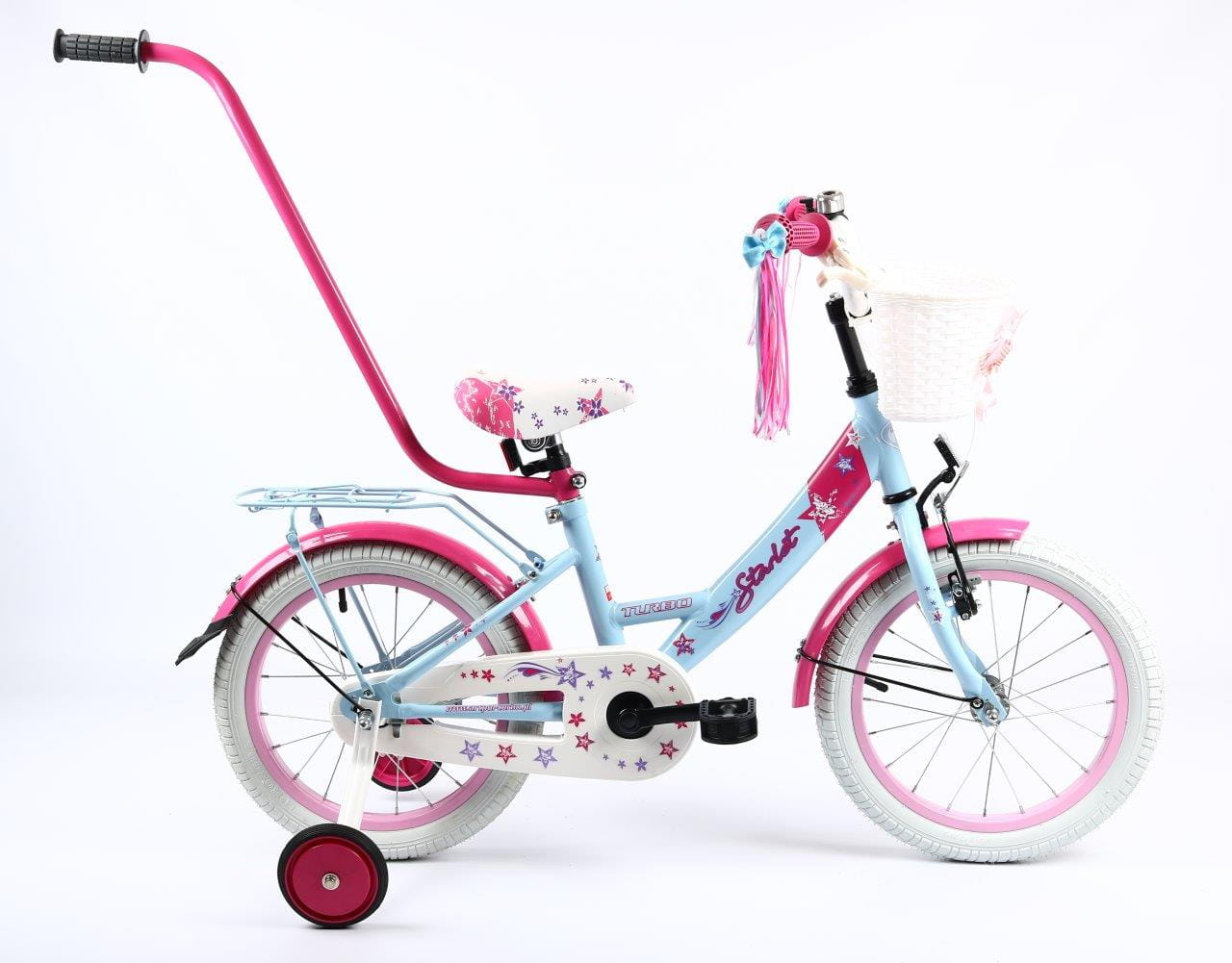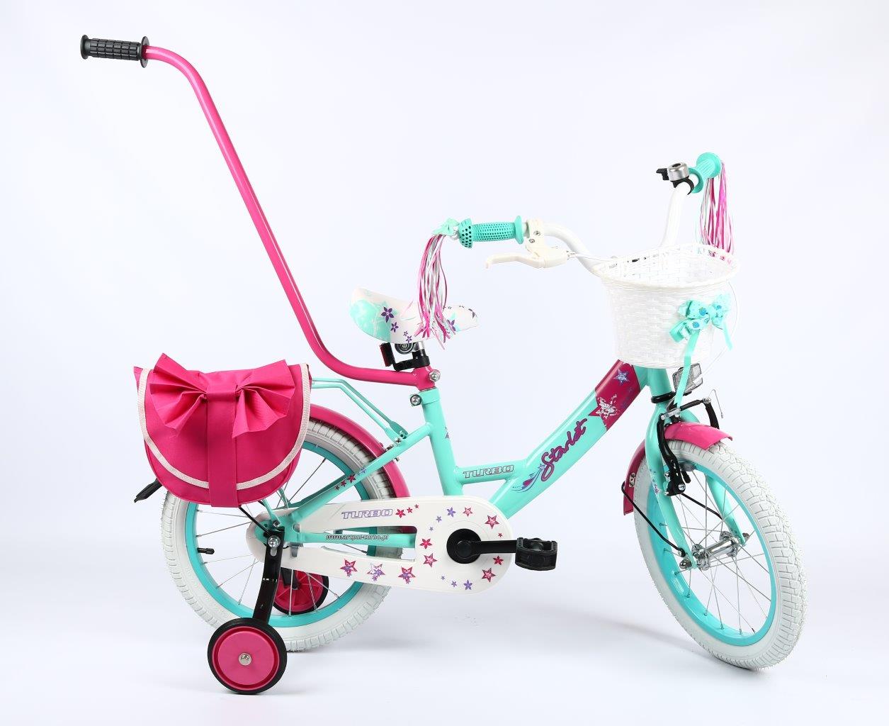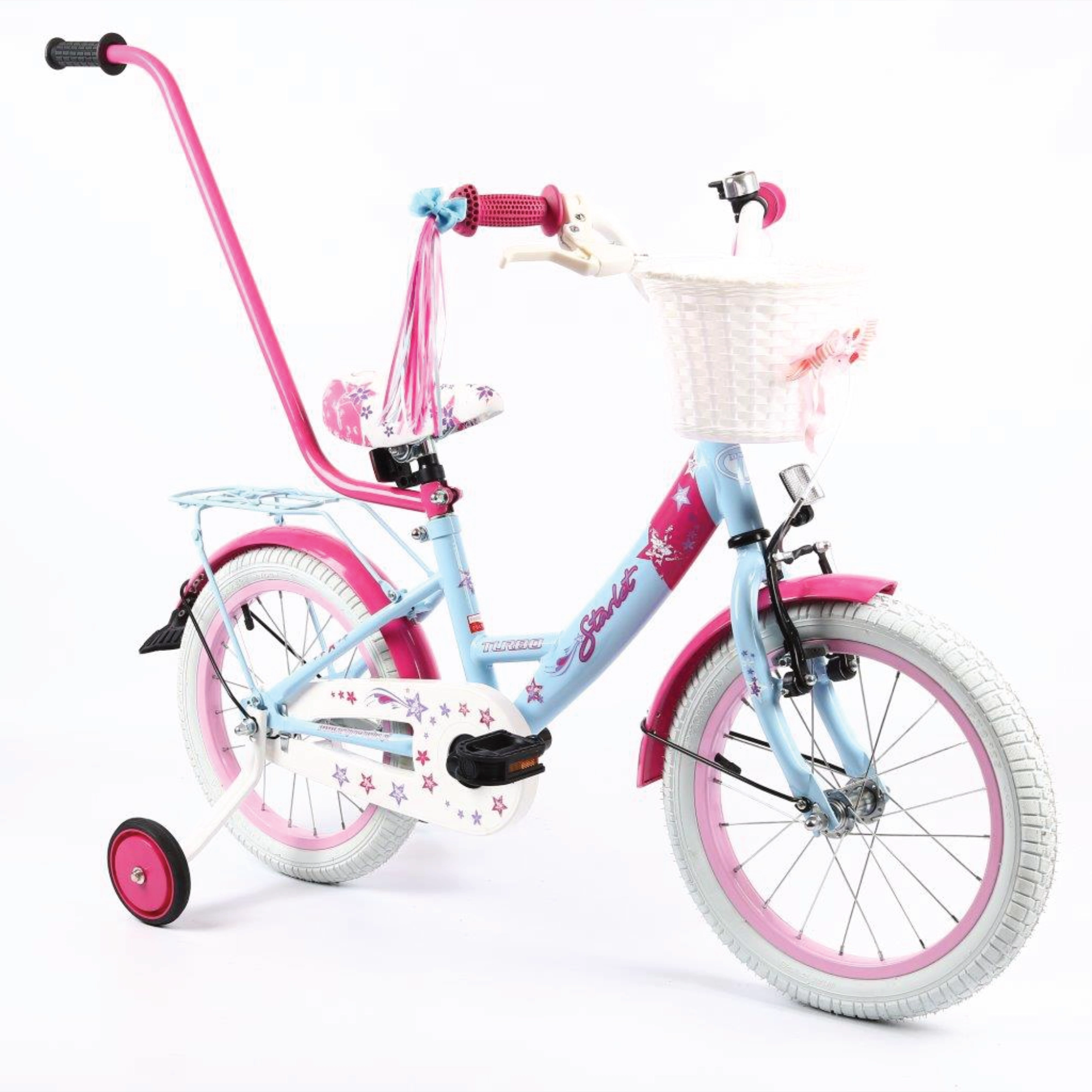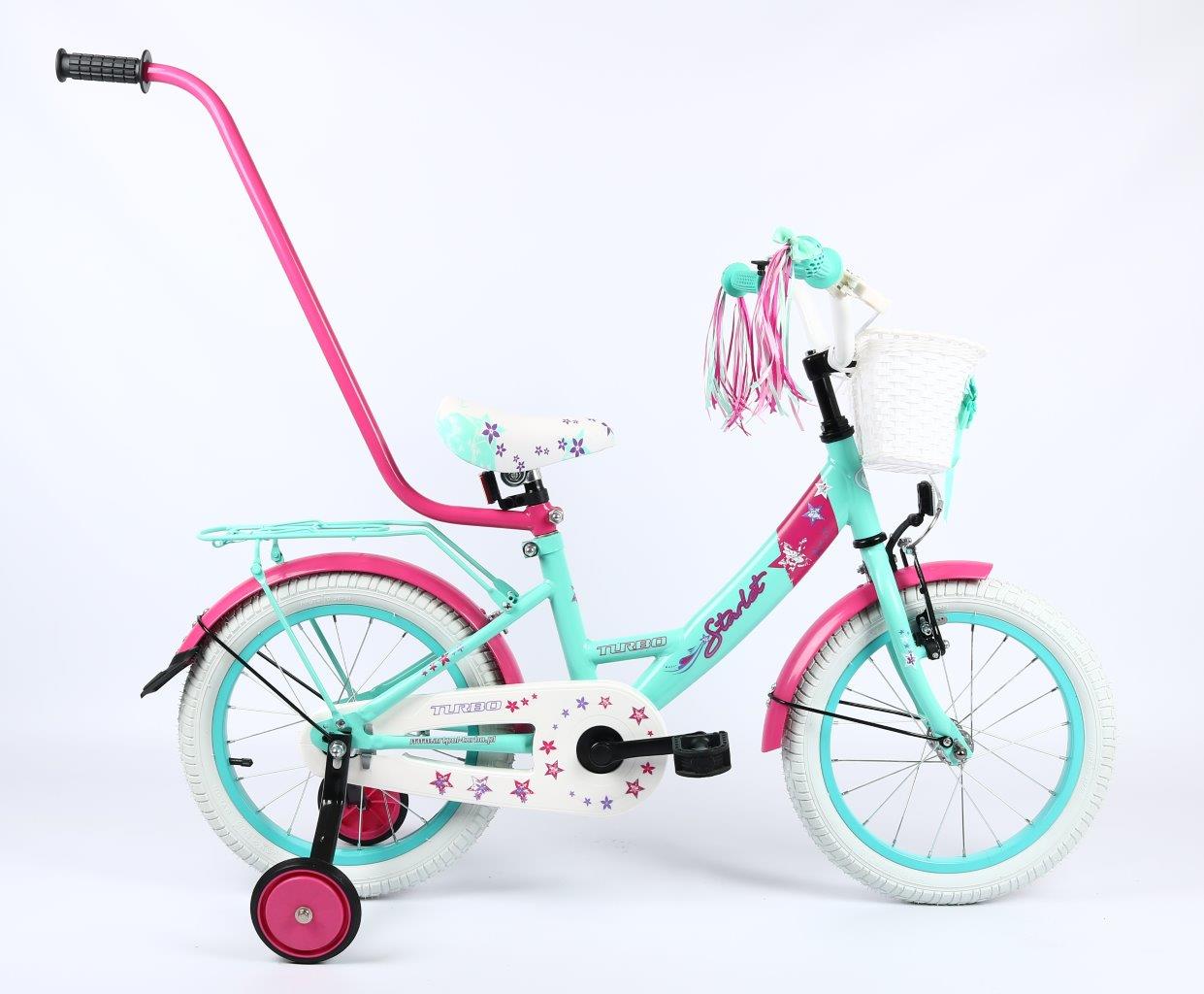 Wyposażenie : dzwonek, kółka podporowe, drążek do prowadzenia, koszyczek przód, wstążki na kierownicę