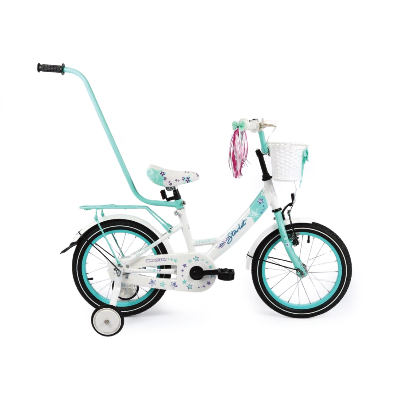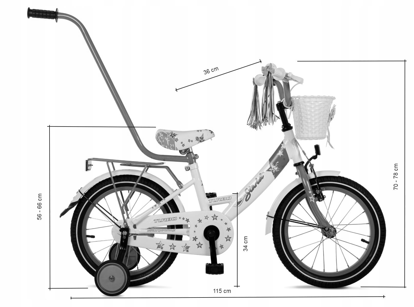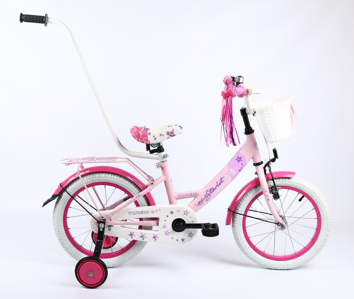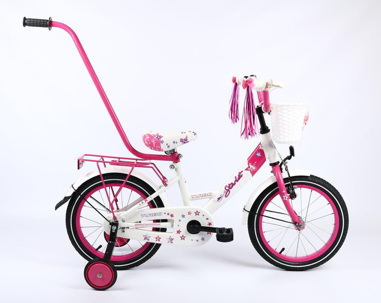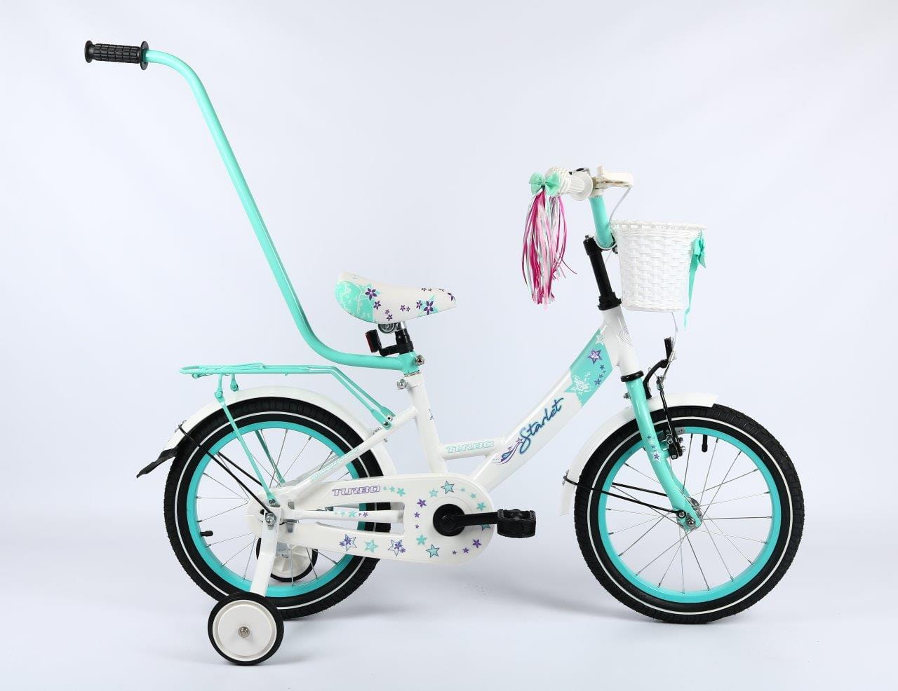 Wyposażenie : dzwonek, kółka podporowe, drążek do prowadzenia, koszyczek przód, wstążki na kierownicę