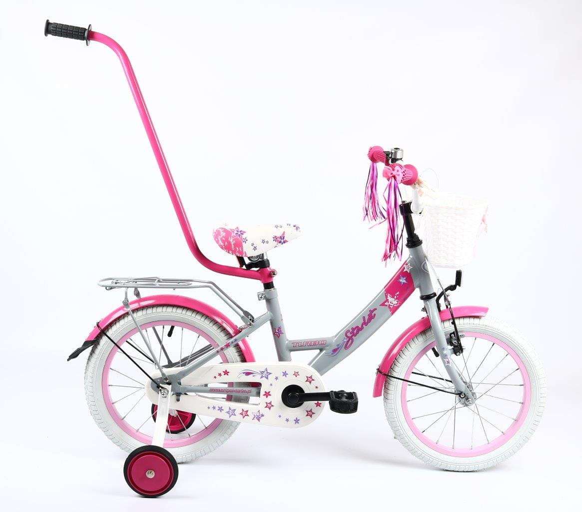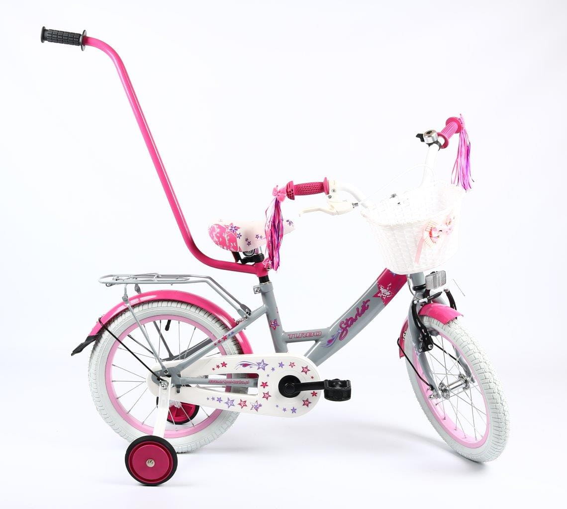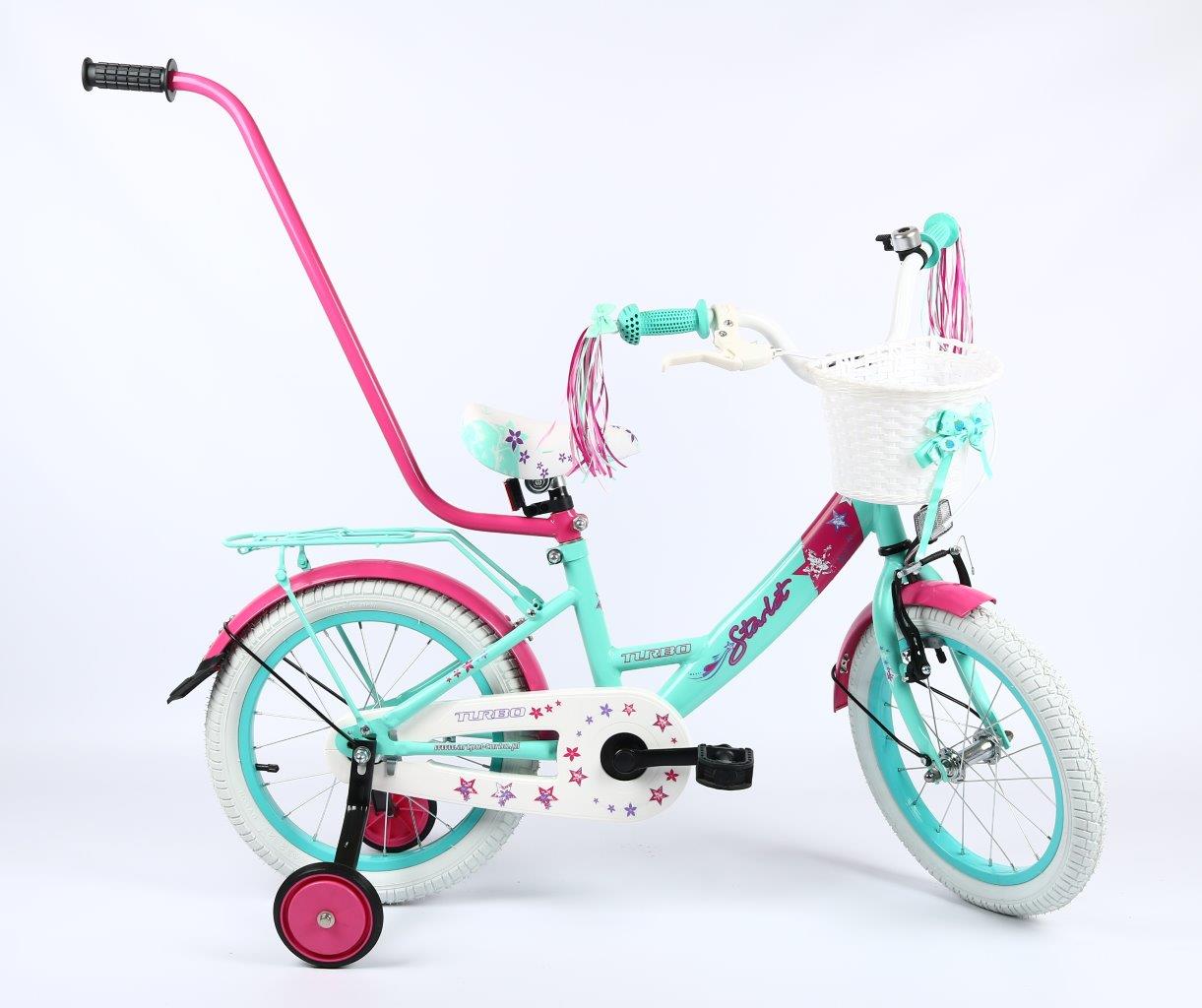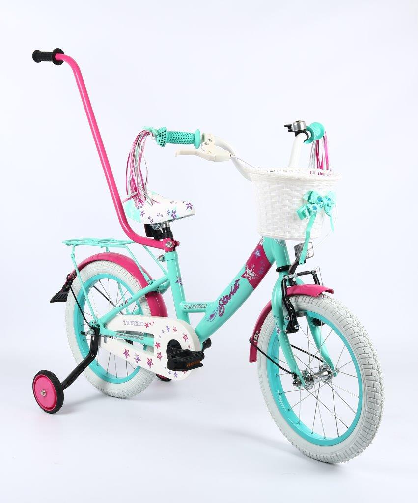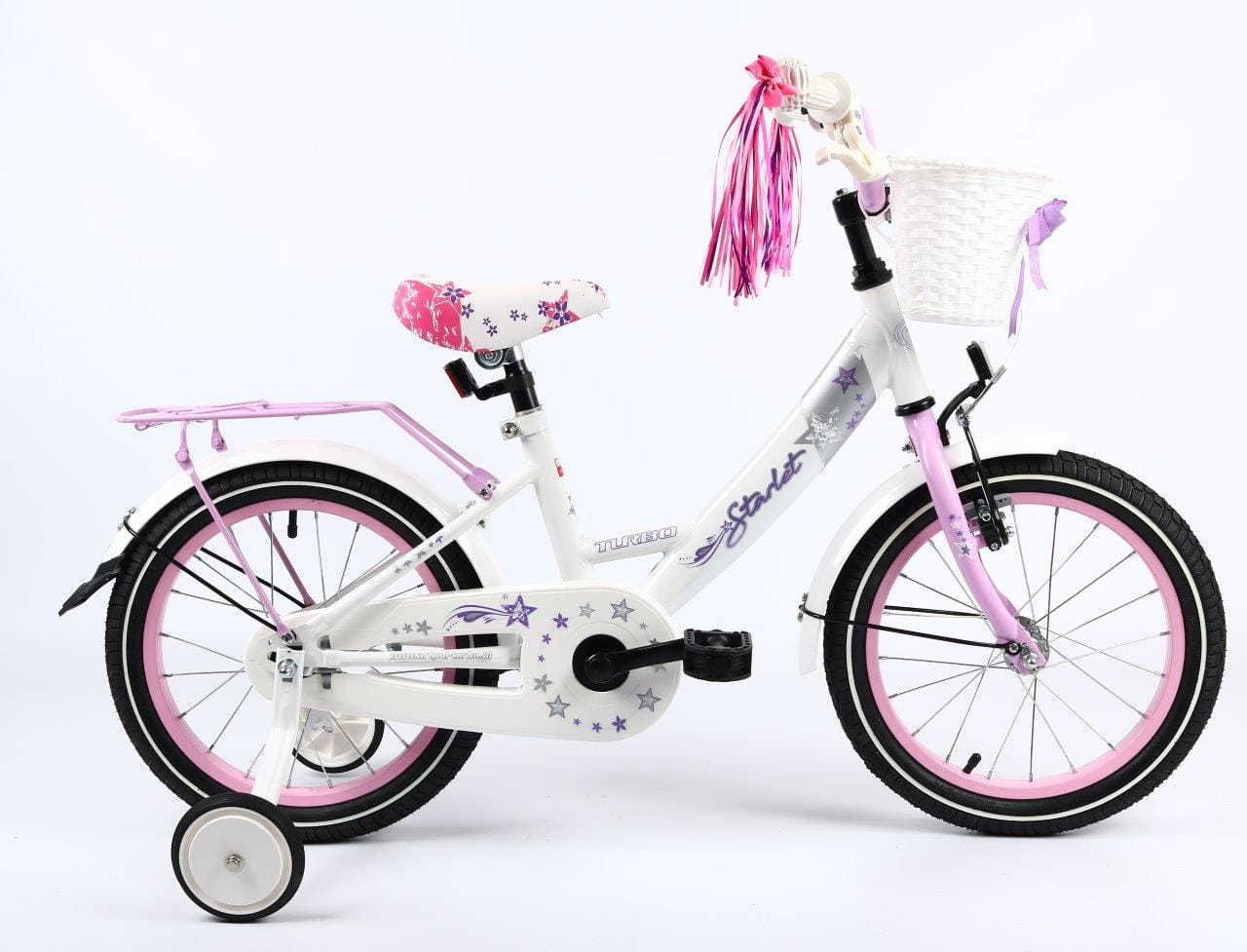 Wyposażenie : dzwonek, kółka podporowe, drążek do prowadzenia, koszyczek przód, wstążki na kierownicę