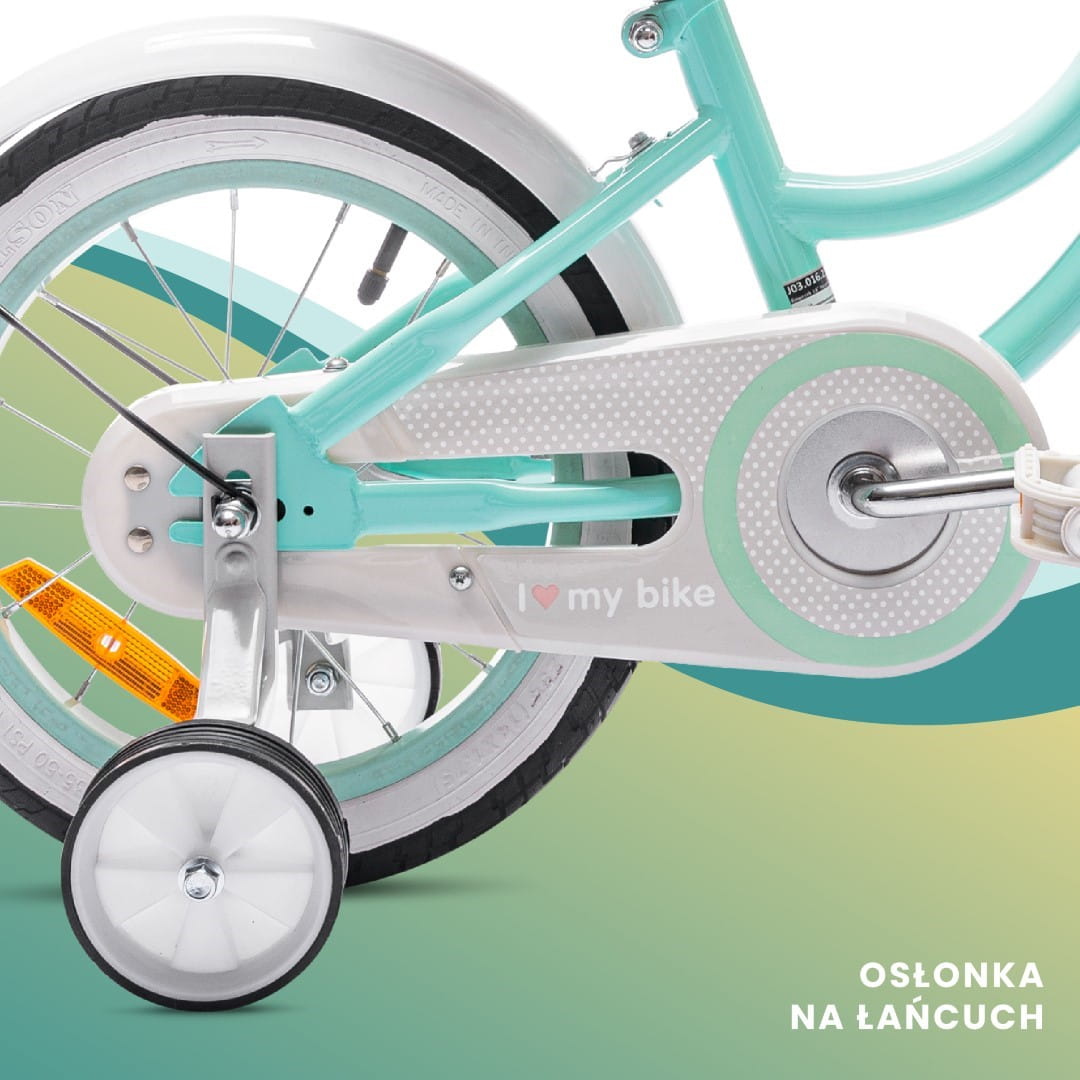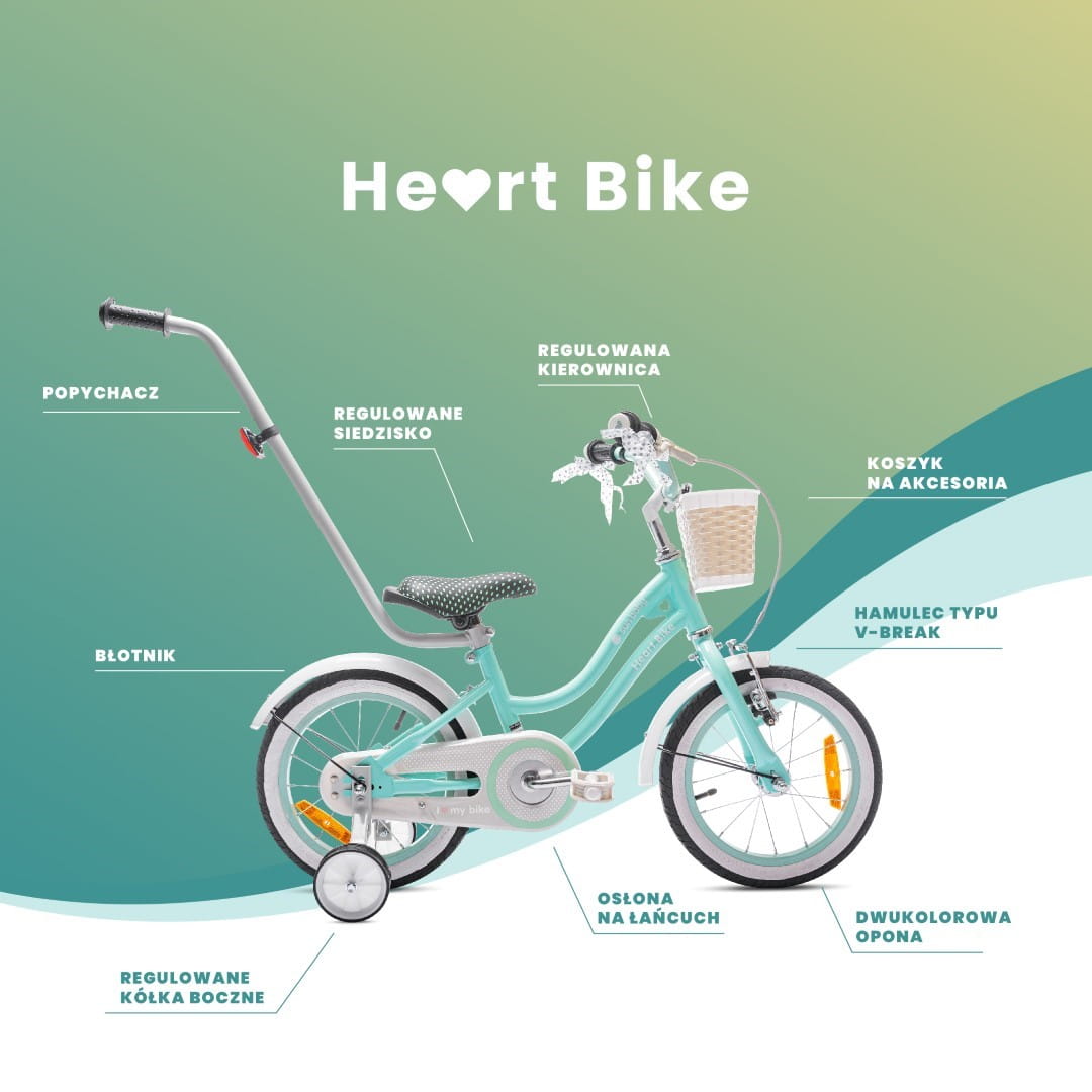 Miętowy rowerek Heart Bike 14 cali to bezpieczny pierwszy rower dla dziewczynki w wieku 3–5 lat. Posiada boczne kółka, regulowane siodełko i kierownicę, koszyk na drobiazgi oraz prowadnik ułatwiający kontrolę jazdy przez opiekuna.