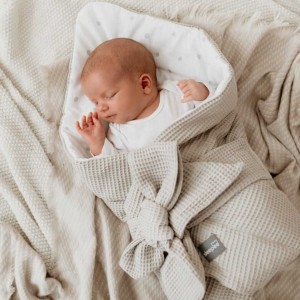 Miękki rożek niemowlęcy Wafelek beżowy z bawełny waflowej i gładkiej zapewnia bezpieczne otulenie od pierwszych dni życia. Antyalergiczne wypełnienie oraz wiązanie na kokardkę gwarantują komfort i idealne dopasowanie.