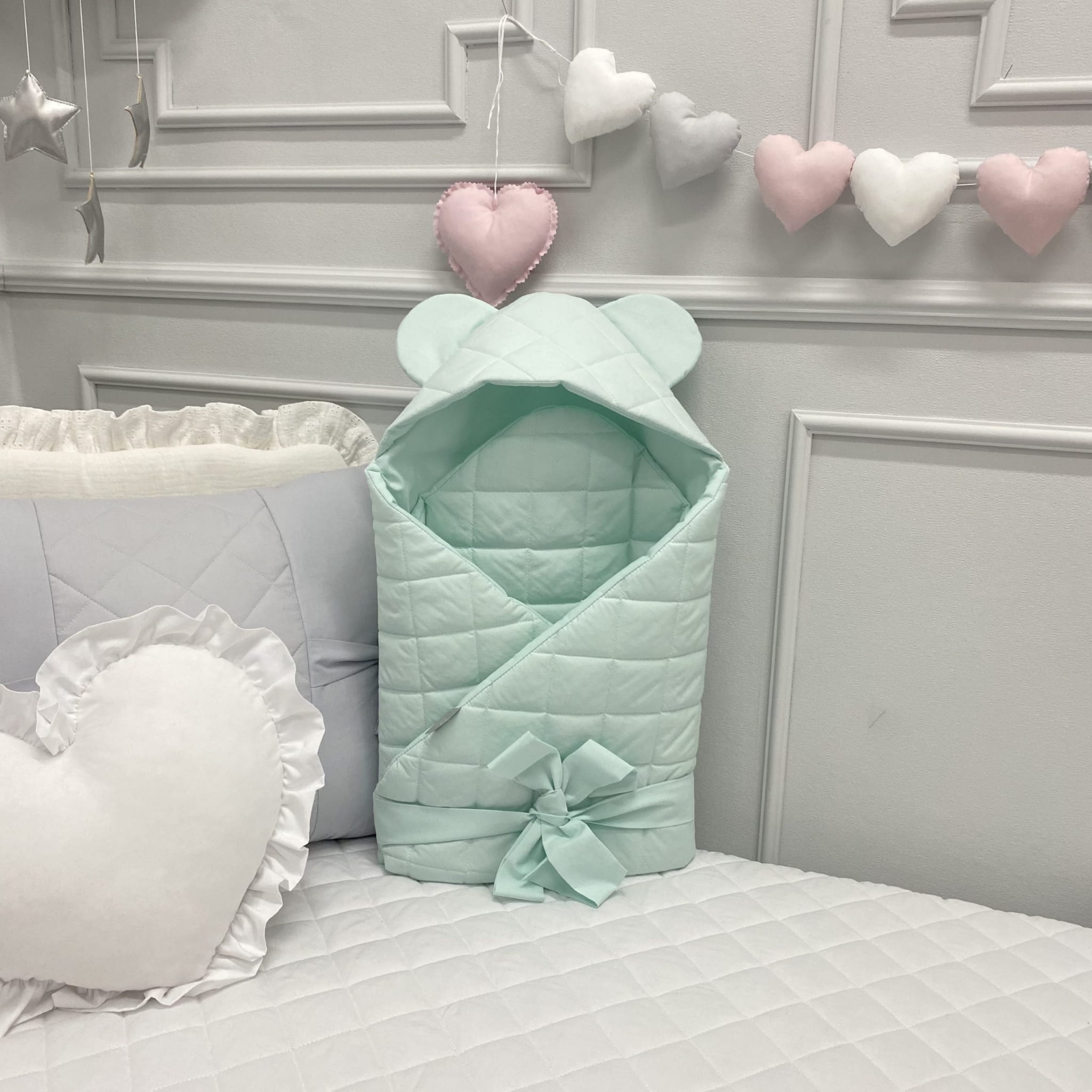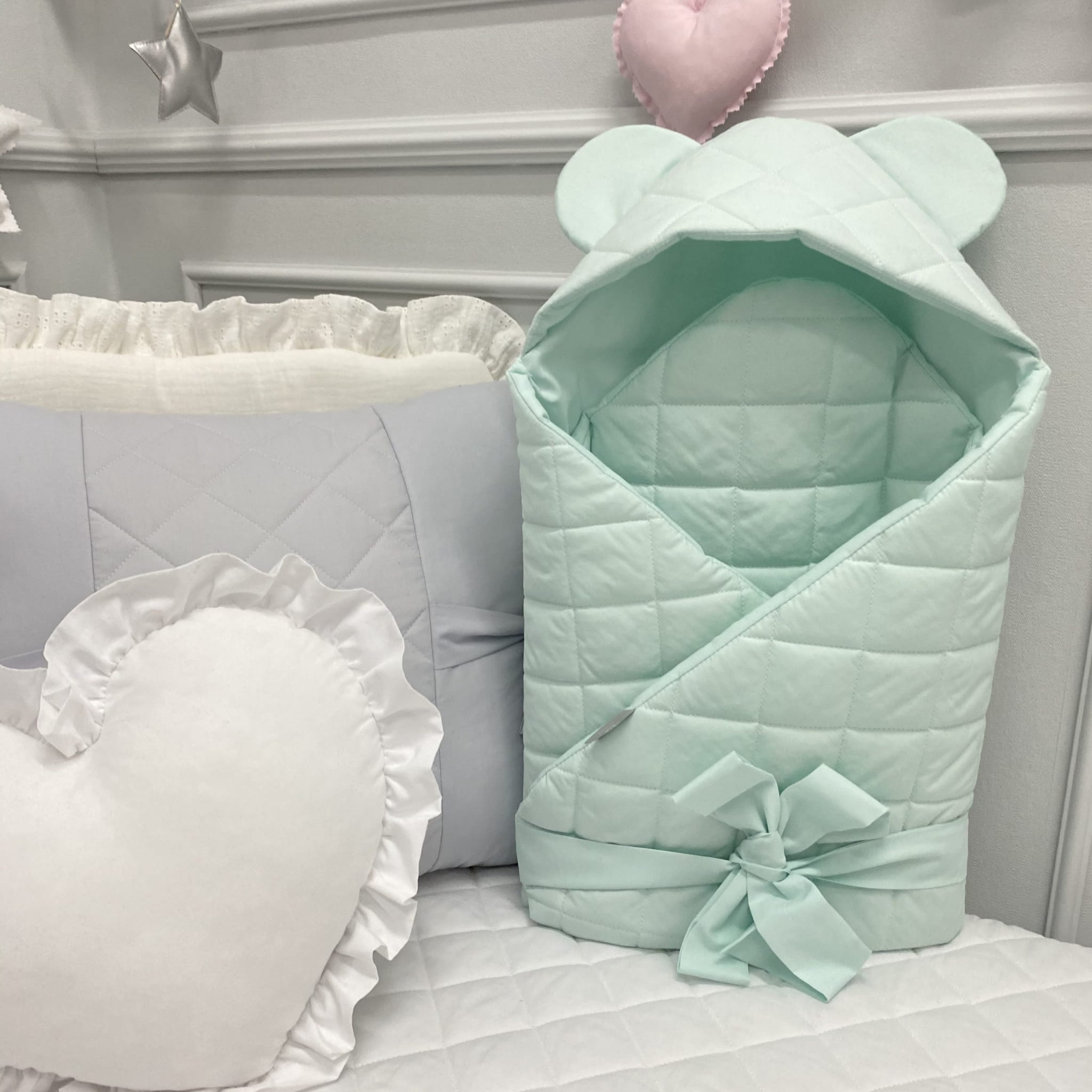Elegancki, pikowany rożek jest mięciutki i milutki. Ten wzór jest niepowtarzalny, ponieważ dodatkowo posiada kapturek. Rożek posiada regulację szerokości, dzięki zastosowaniu dwóch osobnych i długich wstążek. Dzięki takiemu rozwiązaniu możemy lżej lub mocniej zawinąć w nim dzieciątko. W środku znajduje się ok. 1,5 centymetrowe wypełnienie.