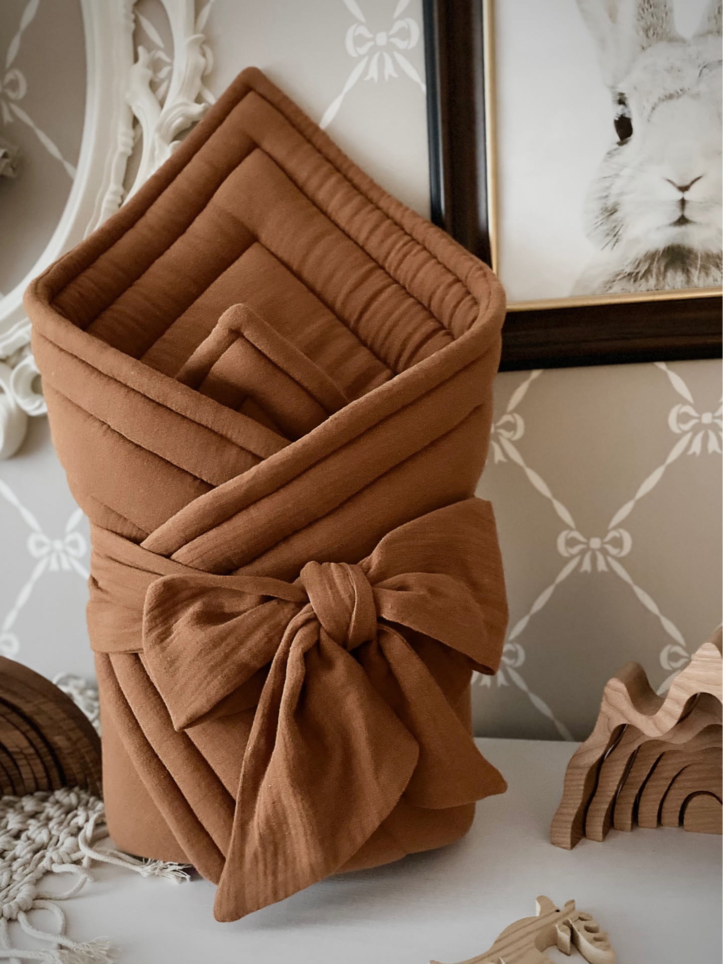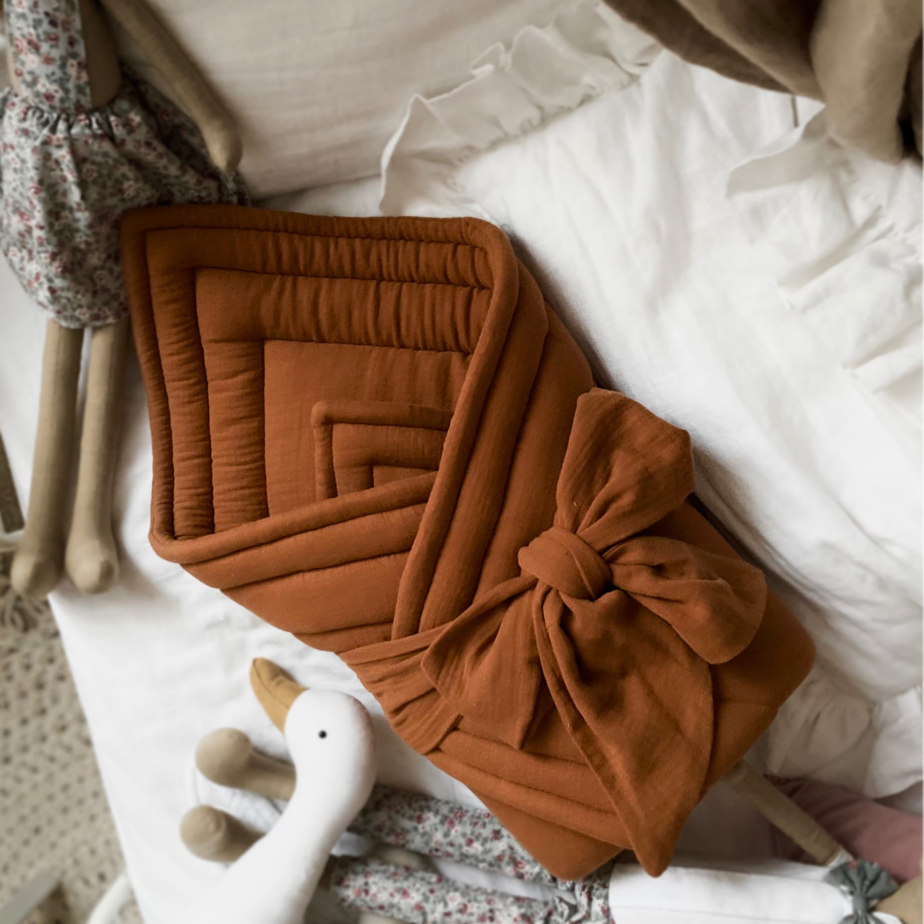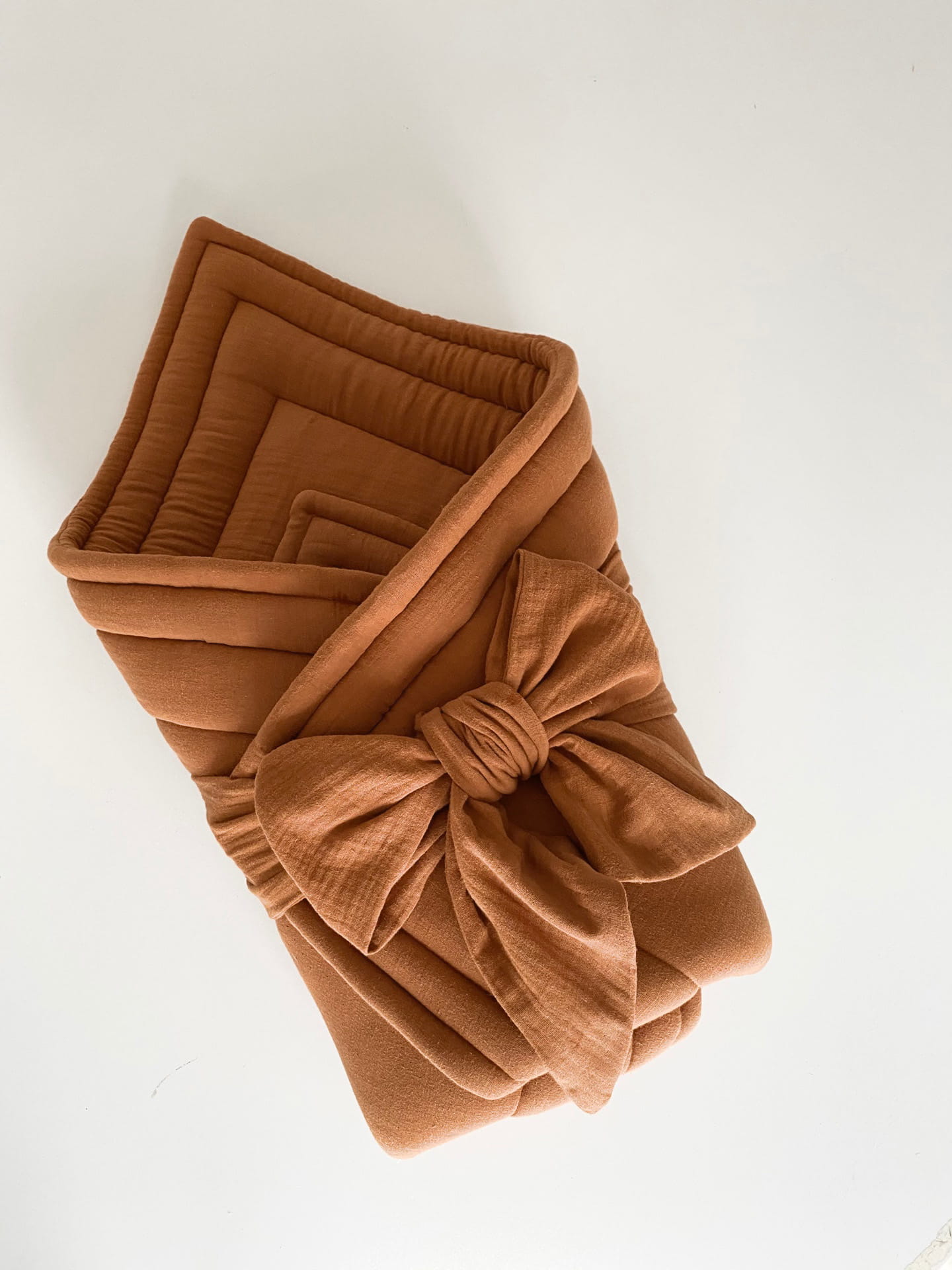 muślinowy rożek dla niemowlaka, doskonały w pierwszych miesiącach życia maluszka. Uszyty z muślinu bawełnianego, zawiązywany na szeroką dekoracyjną kokardę. Po wyjęciu kokardy ze szlufki znajdującej się z tyłu rożka, produkt może posłużyć jako lub mata do zabawy lub ciepła kołderka.