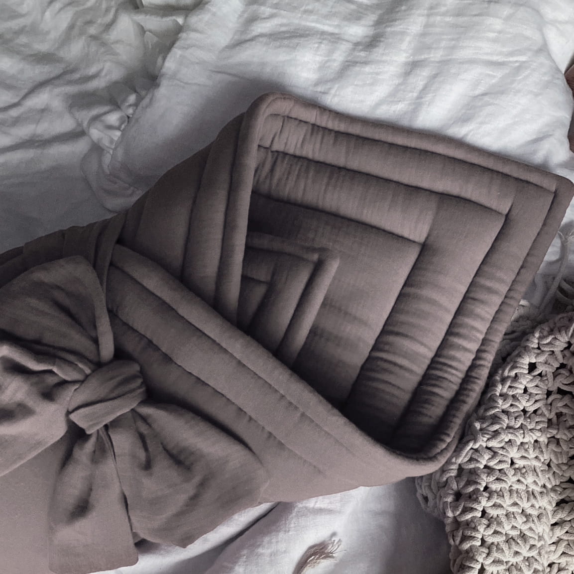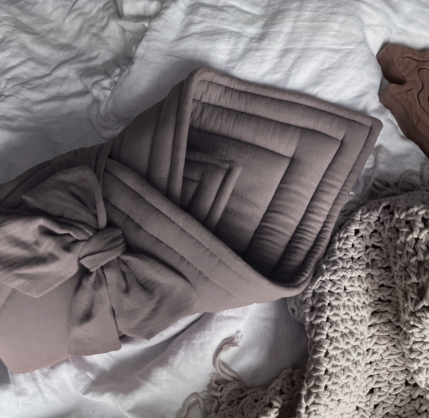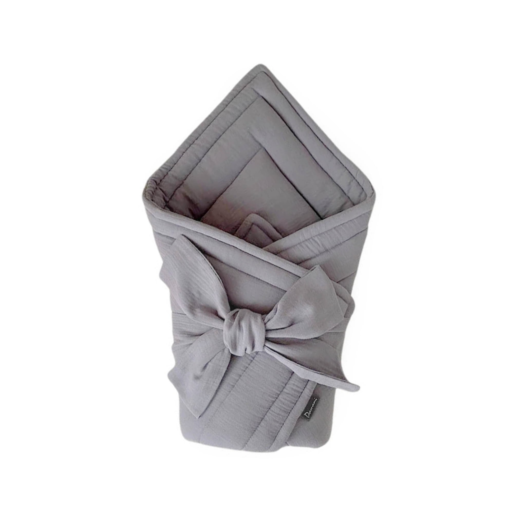 muślinowy rożek dla niemowlaka, doskonały w pierwszych miesiącach życia maluszka. Uszyty z muślinu bawełnianego, zawiązywany na szeroką dekoracyjną kokardę. Po wyjęciu kokardy ze szlufki znajdującej się z tyłu rożka, produkt może posłużyć jako lub mata do zabawy lub ciepła kołderka.