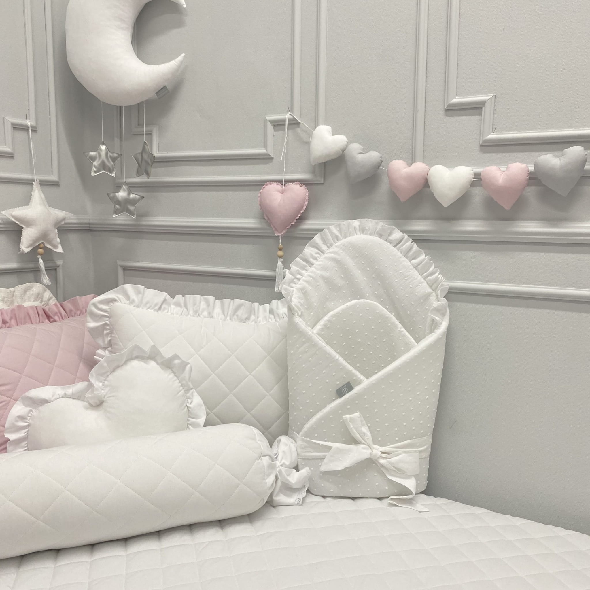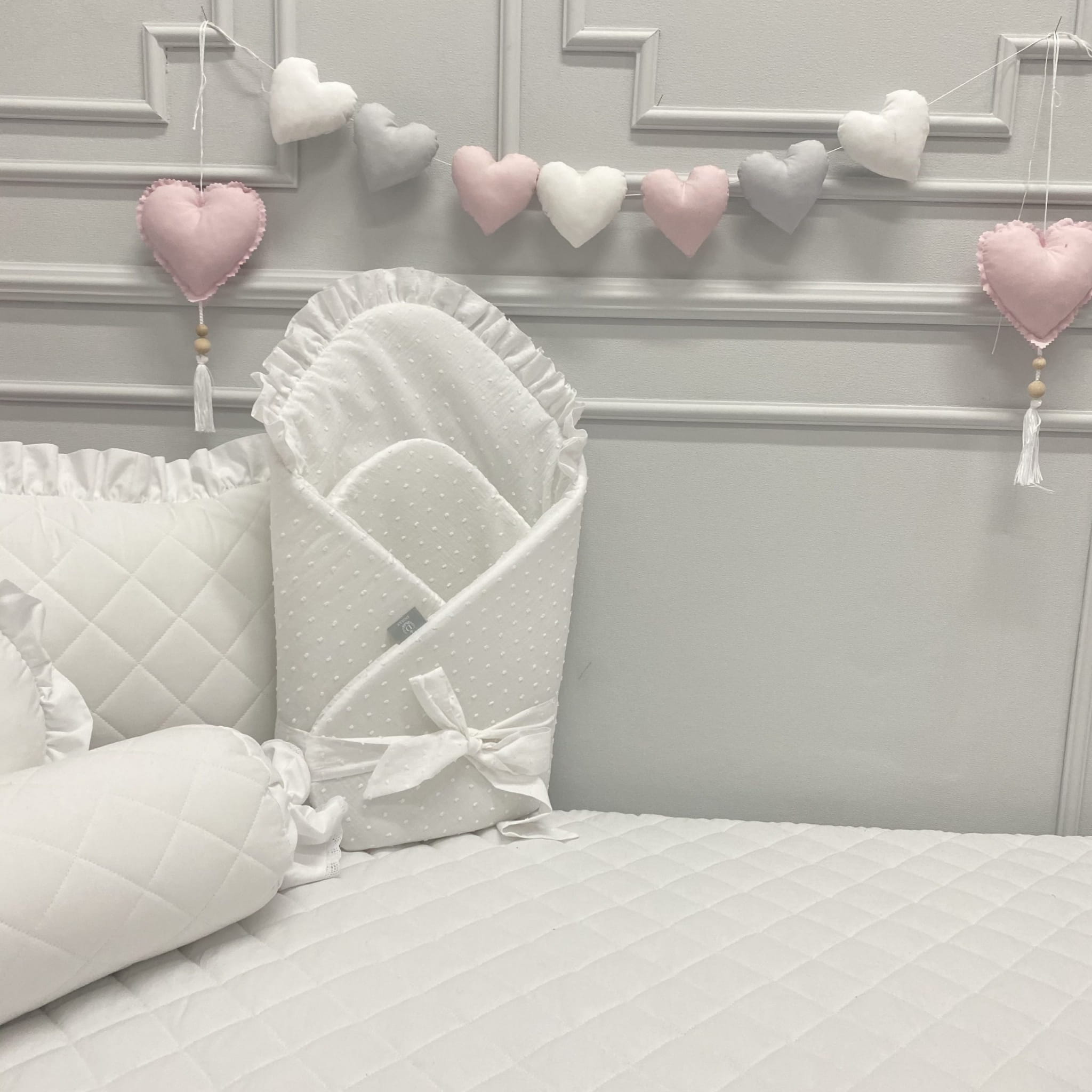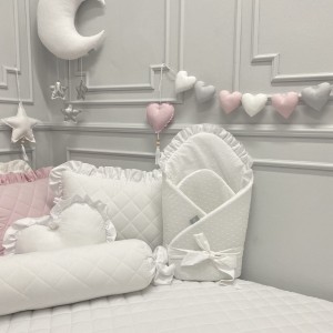 Rożek w białym kolorze z falbanką i kokardką jest mięciutki i milutki. W środku znajduje się ok. 1,5 centymetrowe wypełnienie. Rożek posiada regulację szerokości, dzięki czemu możemy lżej lub mocniej zawinąć w nim dzieciątko.