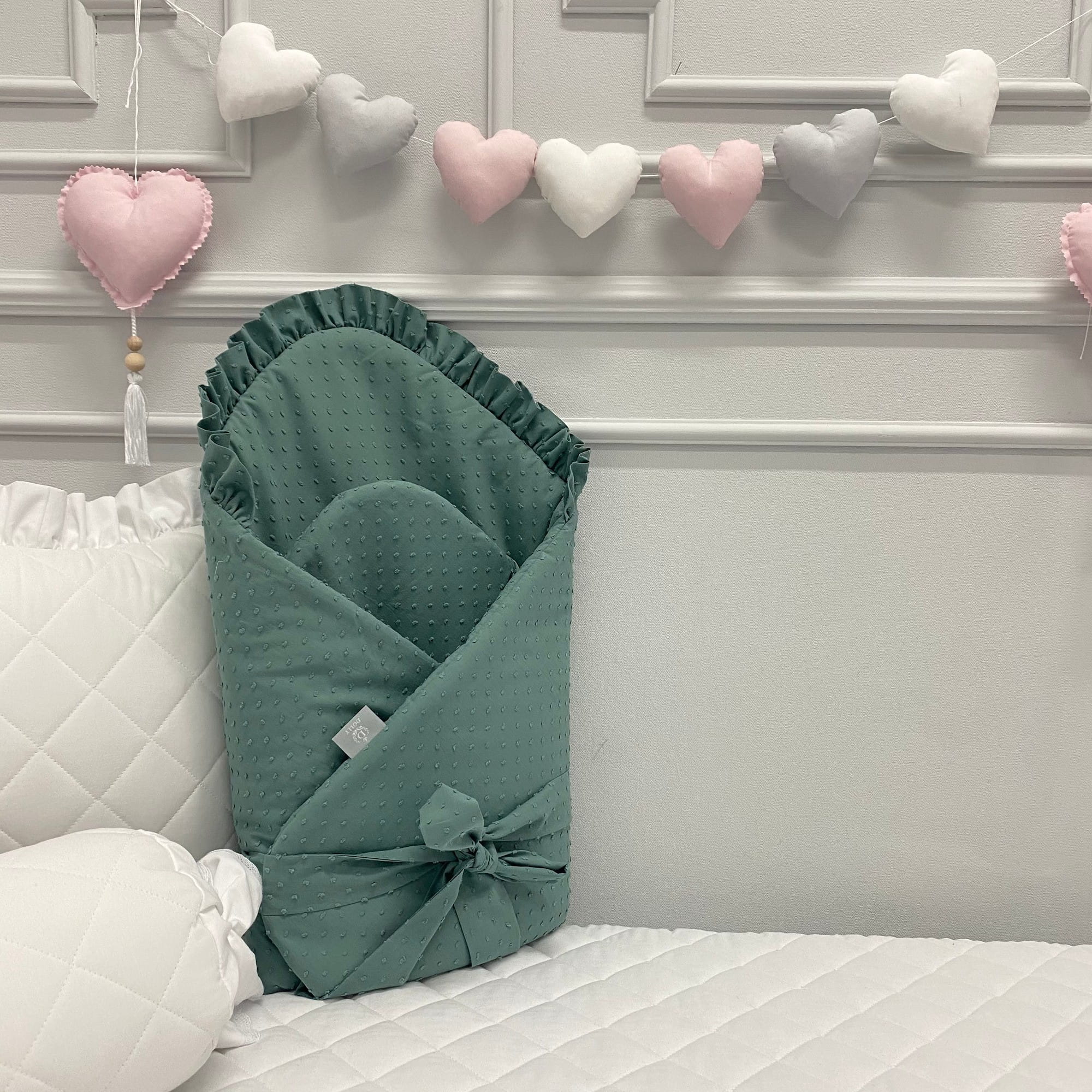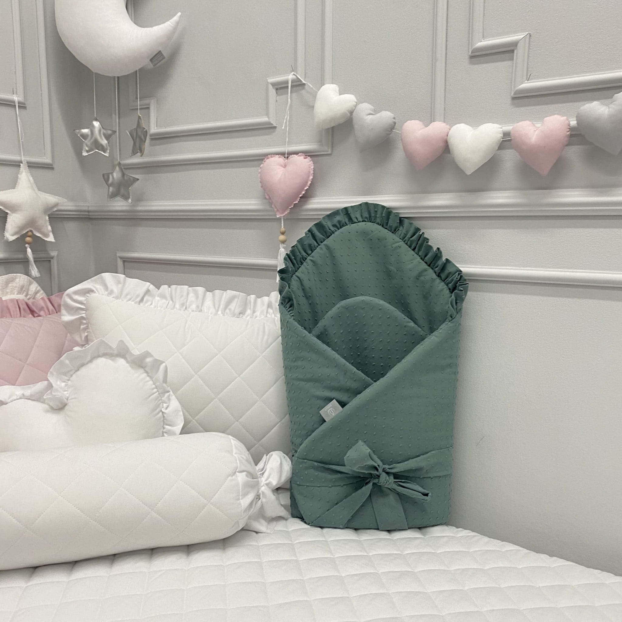 Rożek w zielonym kolorze z falbanką i kokardką jest mięciutki i milutki. W środku znajduje się ok. 1,5 centymetrowe wypełnienie. Rożek posiada regulację szerokości, dzięki czemu możemy lżej lub mocniej zawinąć w nim dzieciątko.