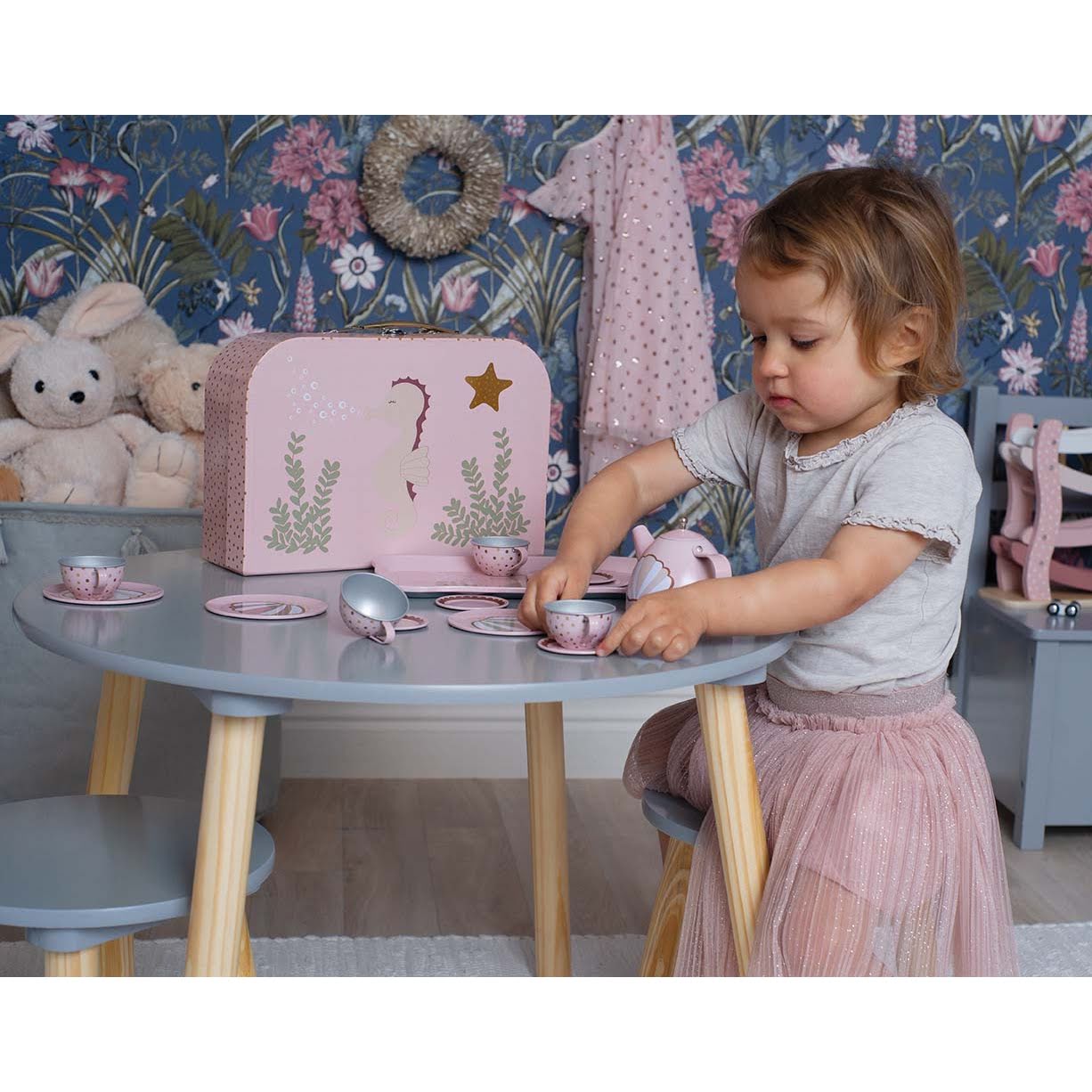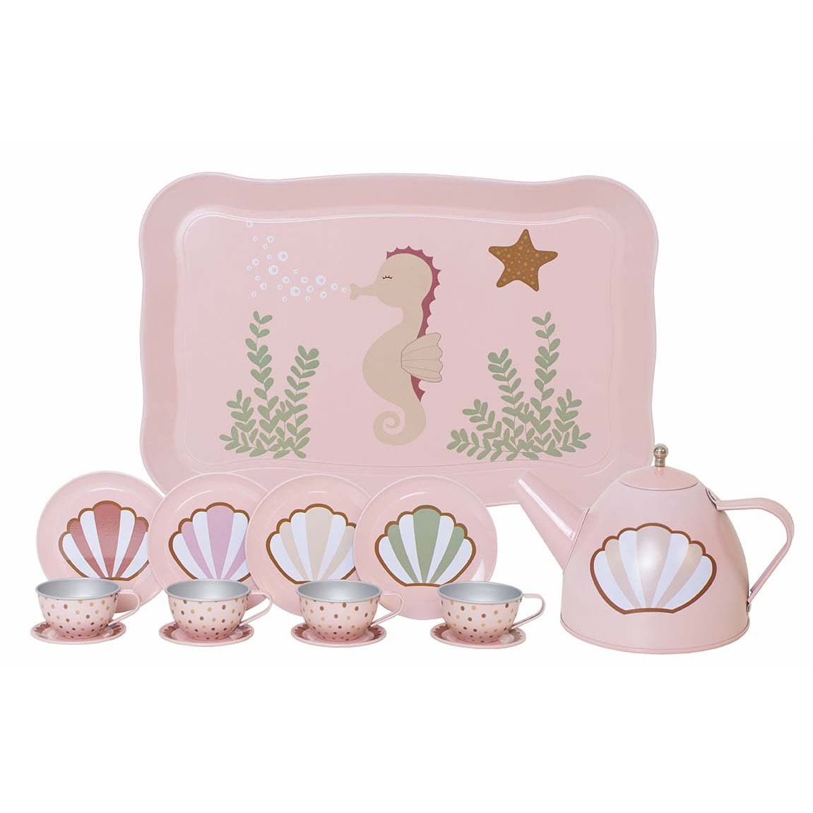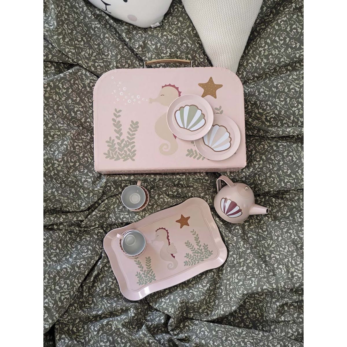 Uroczy, stylowy serwis do herbaty marki Jabadabado w jasnej, pastelowej kolorystyce w małe kropeczki z motywem konika morskiego zachwyci każdą gosposię i jej gości. Serwis wykonany z wysokiej jakości metalu, zapakowany w tekturową walizkę przeznaczony dla czterech osób.