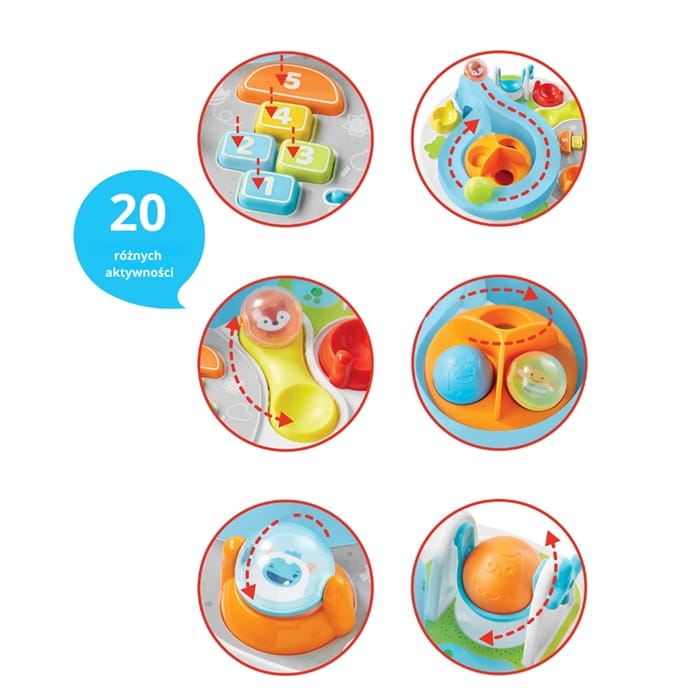 Aktywności: ponad 20 interaktywnych zabaw, takich jak huśtawka z dźwiękiem, zjeżdżalnia, obracające się piłeczki, interaktywne pokrętła
