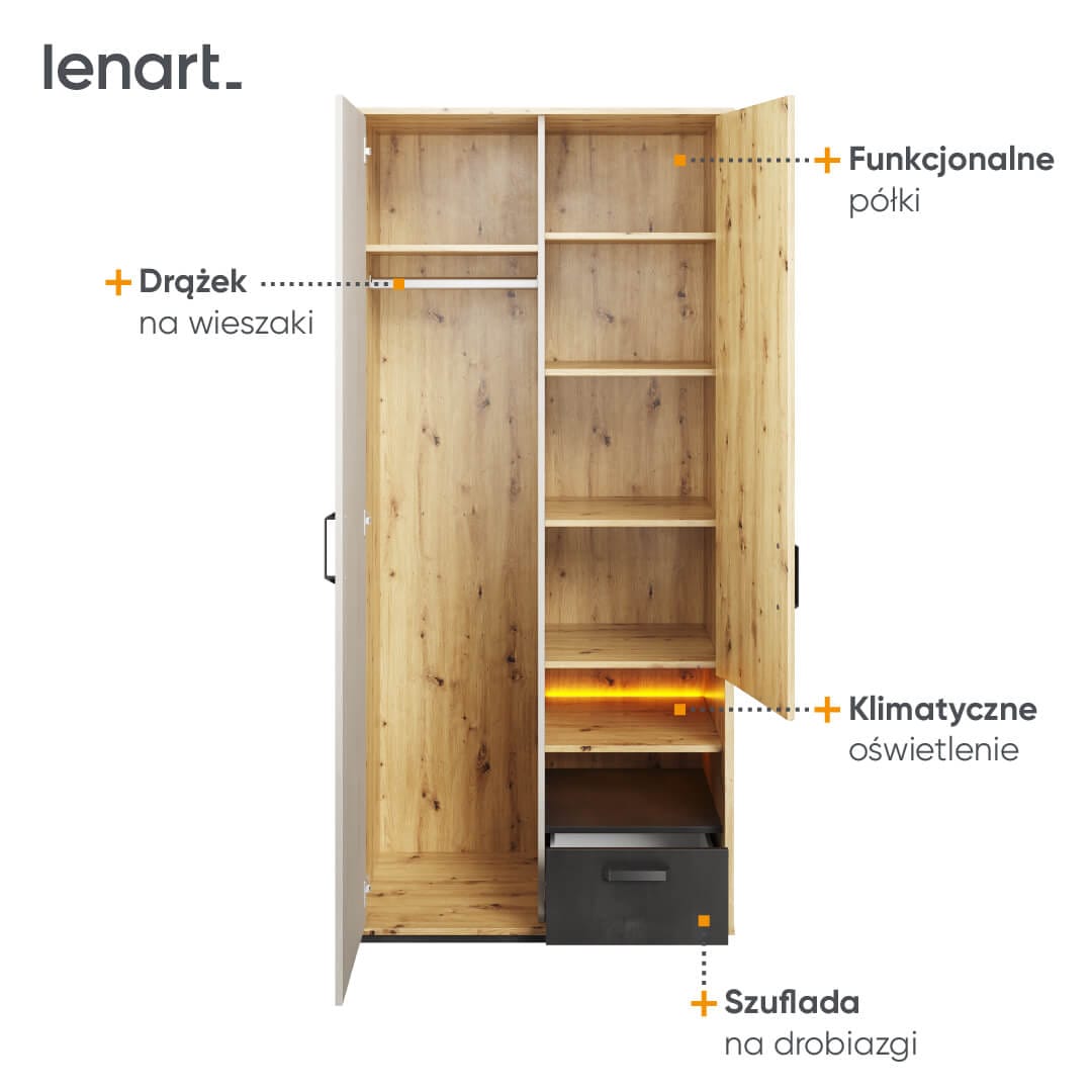Pojemna szafa Qubic QB‑03 wyposażona w drążek, półki, szufladę i dwie dekoracyjne wnęki — w zestawie oświetlenie LED. Idealny wybór do pokoju młodzieżowego.