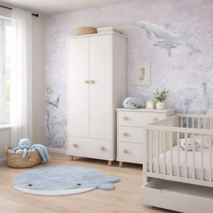 Szafa LUMI łączy w sobie skandynawską prostotę i maksymalną funkcjonalność. Dwudrzwiowy front kryje dwa metalowe drążki po lewej stronie, idealne dla wieszaków, a po prawej cztery półki — wygodne do składania ubranek lub przechowywania pudełek. Dodatkowo dolna szuflada na prowadnicach kulkowych daje łatwy dostęp do pościeli, zabawek lub akcesoriów.