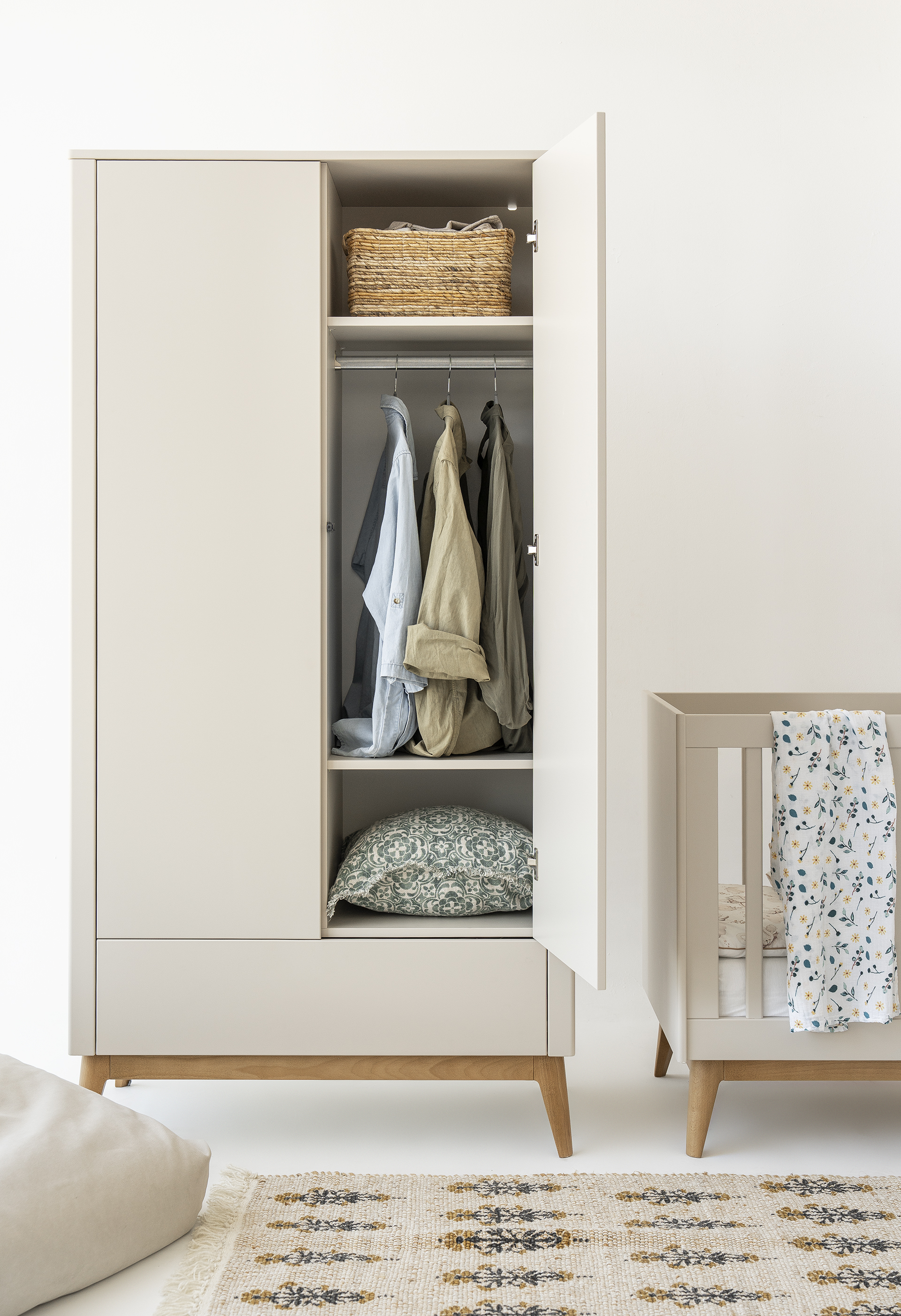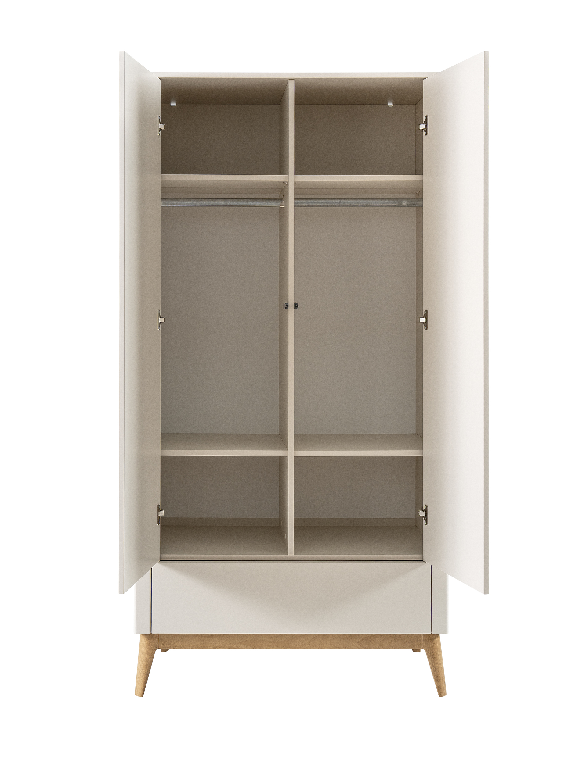 Elegancka szafa dwudrzwiowa z kolekcji PINIO Seth łączy nowoczesny design z funkcjonalnym układem wnętrza. Wyposażona w dwie regulowane sekcje z półkami i drążkami oraz pojemną szufladę push-to-open, oferuje wygodne przechowywanie ubrań i akcesoriów. Solidna konstrukcja z MDF, laminowanej płyty i litego drewna bukowego, a także bezpieczne materiały zgodne z normami EN 71-3 i EN 16516, gwarantują trwałość i komfort użytkowania.