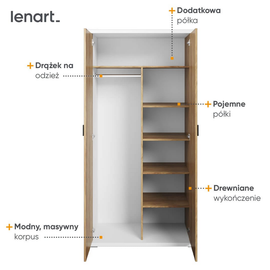 Mebel inspirowany stylem skandynawskim — połączenie bieli z dekoru hikora naturalna tworzy przytulną, minimalistyczną przestrzeń. Cofnięte fronty i masywny korpus nadają bryle nowoczesny i stabilny charakter. Dzielone wnętrze (drążek + półki) wspiera organizację garderoby, a estetyka pasuje do każdego pokoju młodzieżowego.
