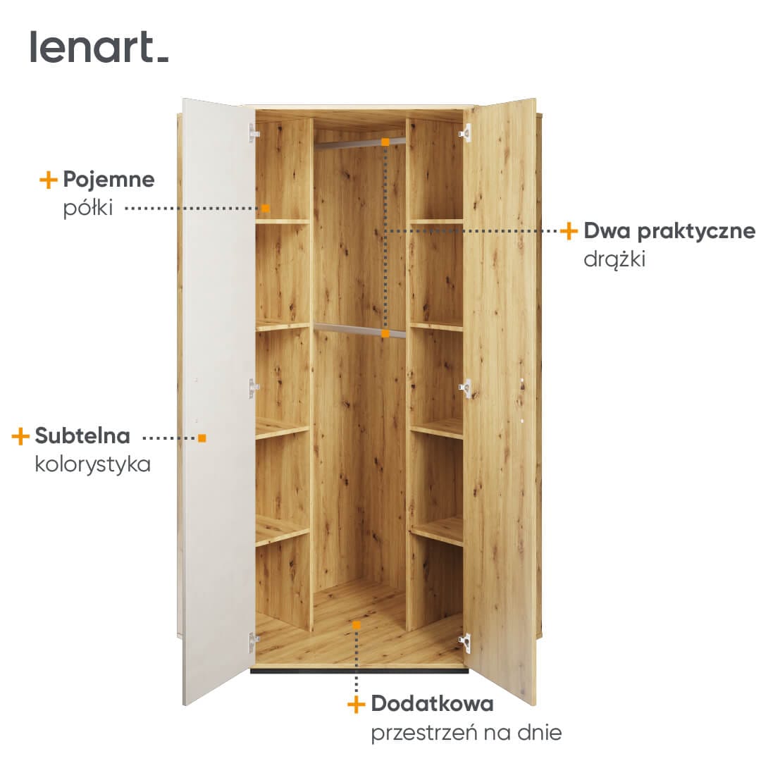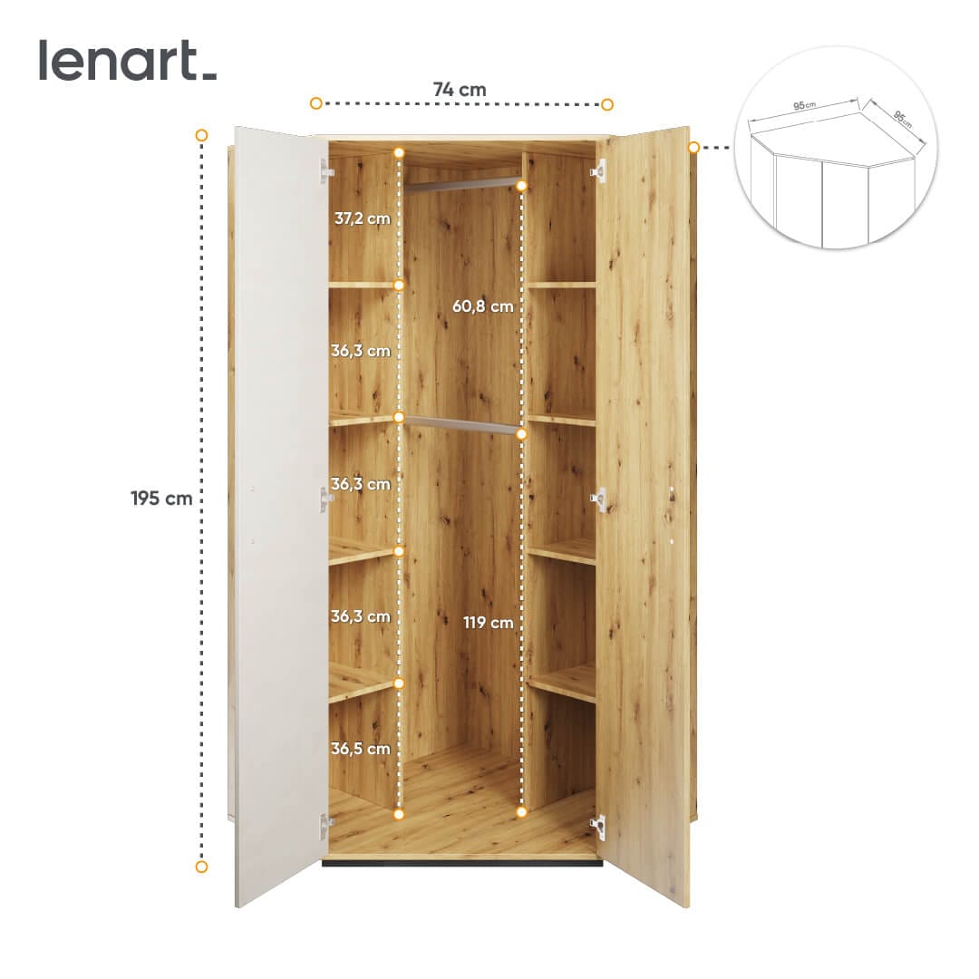 Szafa QB‑01 to przemyślana, narożna propozycja od Lenart, zaprojektowana do dużego wykorzystania narożnych przestrzeni pokoju. Nowoczesny design z frontami wsuniętymi pod korpus oraz geometryczne wybarwienie w odcieniach dąb artisan, silk flou i raw steel nadają bryle wyrazisty charakter. Metalowe uchwyty oraz niskie nóżki dodają subtelnej lekkości całej konstrukcji.