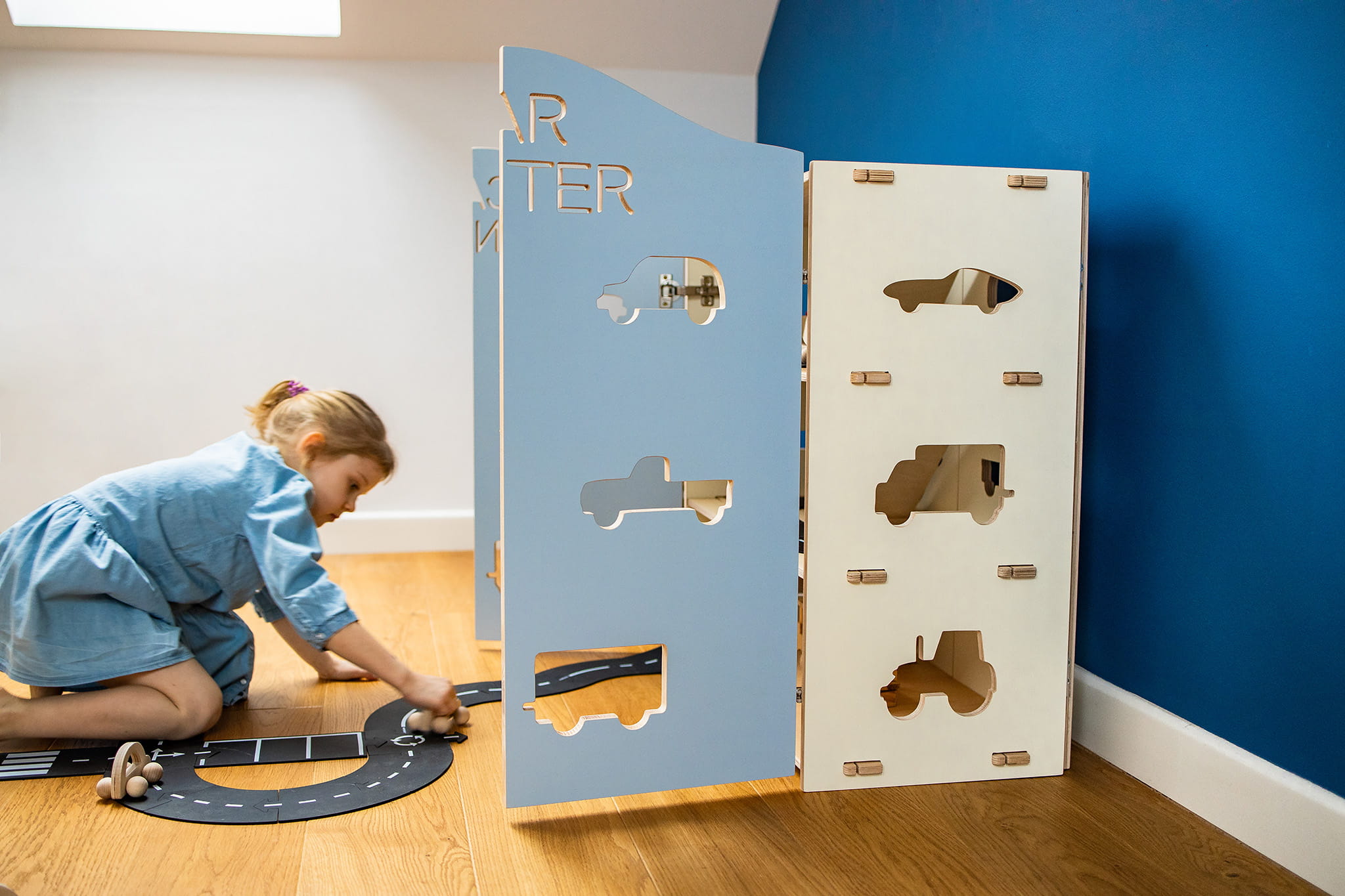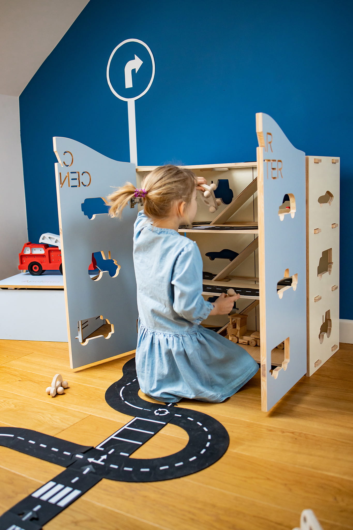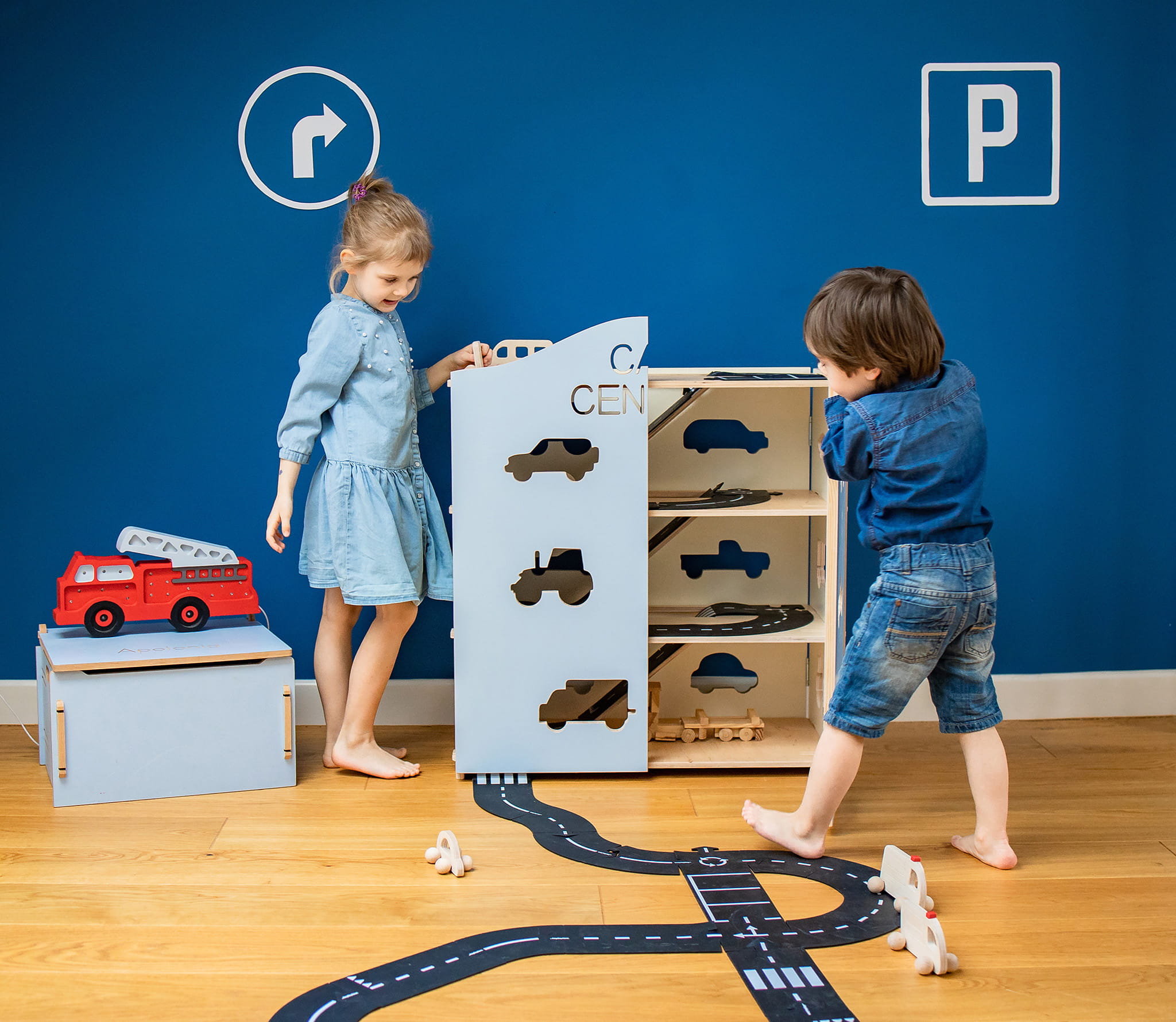 Nowość w postaci szafki. Jednak nie takiej zwykłej. W jej wnętrzu, na półkach można pochować czy to ubrania, czy to książki, ale mebel może stać się również wielopoziomowym parkingiem dla samochodów. Auta mogą się przemieszczać między platformami dzięki specjalnej zjeżdżalni, którą można w każdej chwili wyjąć uzyskując szafkę. To znakomite miejsce na przechowanie ulubionych resoraków. To nie wszystko.