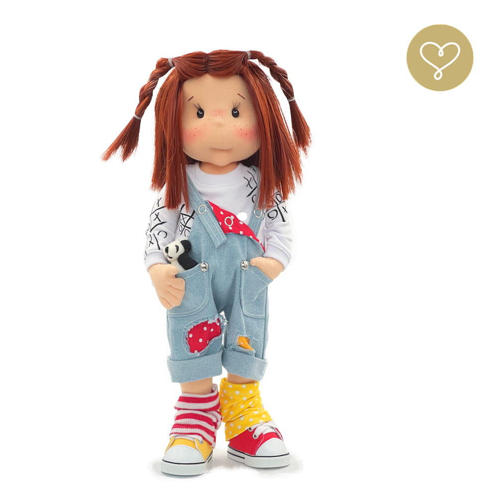 Ręcznie szyta szmaciana lalka Bobby od Lullu Dolls – 38 cm, ruchomy szkielet, włosy do czesania i maskotka panda w zestawie. Idealna do zabawy i kolekcji.