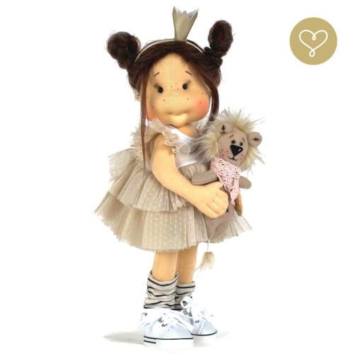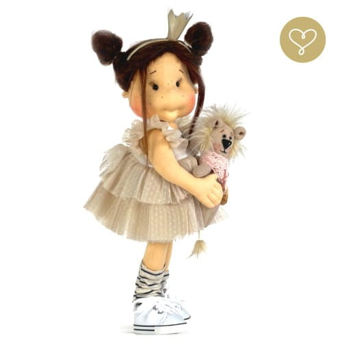 Poznaj wyjątkową szmacianą lalkę Candy Lou od Lullu Dolls – ręcznie szytą, bezpieczną i niezwykle uroczą towarzyszkę zabaw dla dzieci powyżej 3 roku życia. Ta lalka z naturalnymi włosami alpaki ma około 38 cm wysokości i w zestawie posiada swojego najlepszego przyjaciela – maskotkę lwa Miombo.