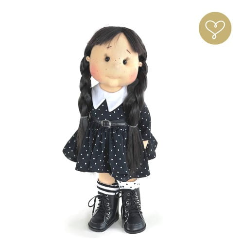 Ręcznie robiona szmaciana lalka dla dzieci Midnight – Lullu Dolls. Piękna, bezpieczna, z certyfikatem CE, dostępna w wersji z ruchomym szkieletem. Idealna na prezent!