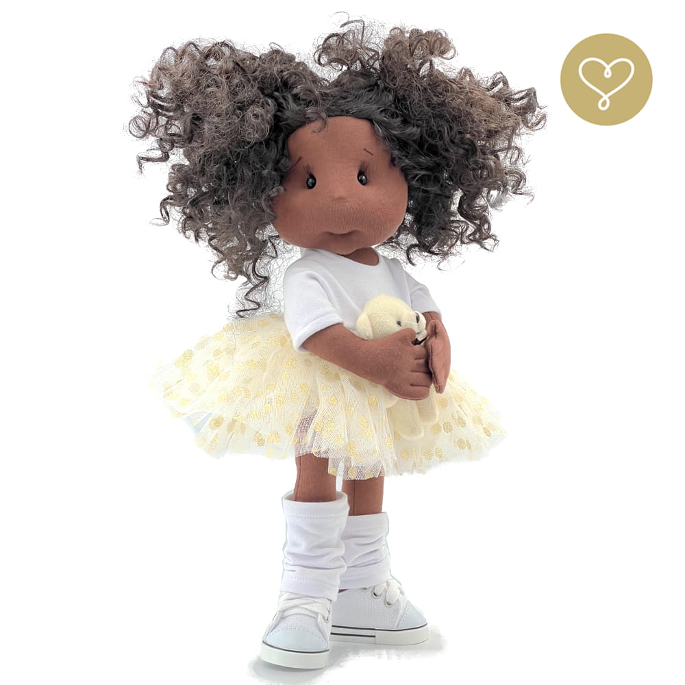 Szmaciana lalka Sofia od Lullu Dolls to niezwykła towarzyszka dziecięcych zabaw, wykonana z ogromną dbałością o każdy detal. Sofia jest Polką, a jej tata pochodzi z Nigerii – to połączenie sprawia, że lalka uczy dzieci otwartości, empatii i akceptacji różnorodności. Sofia emanuje spokojem i równowagą, roztaczając wokół siebie aurę domowego ciepła i bezpieczeństwa.