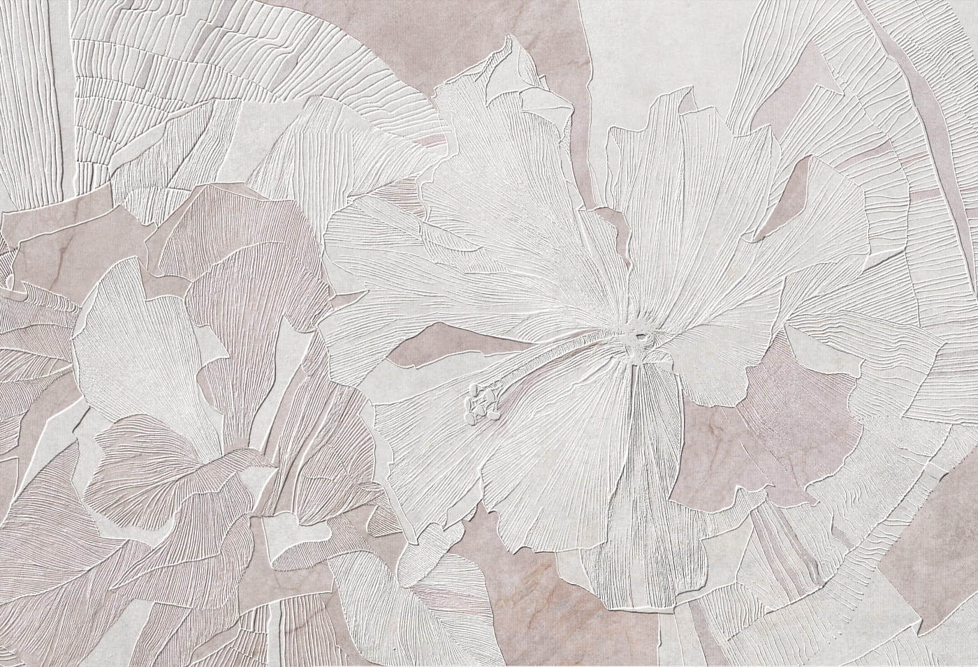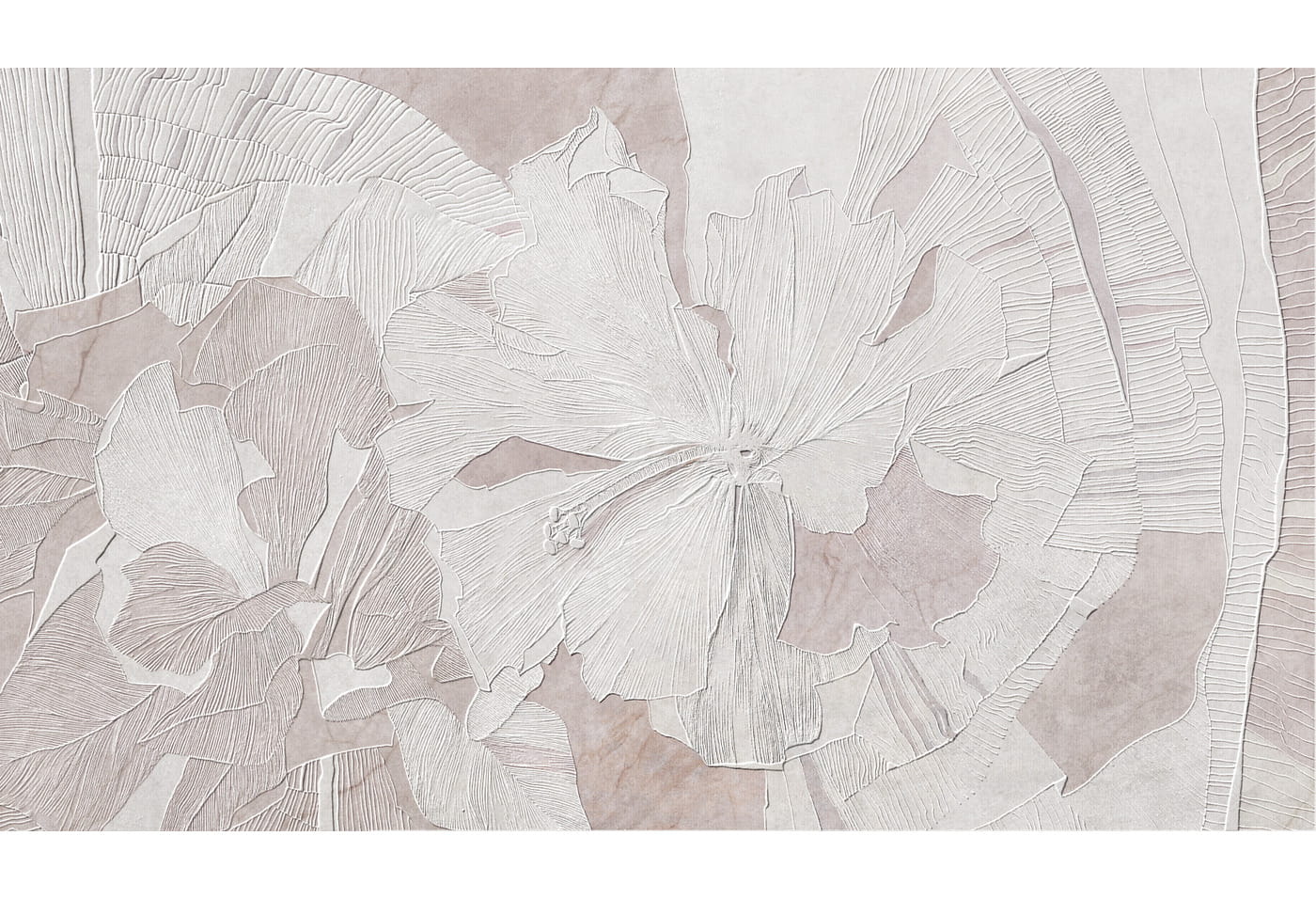 - Motyw: Tapeta przedstawia piękne, duże kwiaty hibiskusa w odcieniach różu, otoczone delikatnymi zielonymi liśćmi. Wzór jest detaliczny, co nadaje tapecie artystyczny i elegancki charakter.