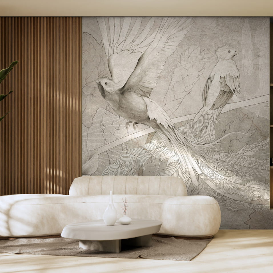 - Kolorystyka: Dominującym kolorem jest ciepły odcień szarości (warm grey), który doskonale komponuje się z różnymi paletami kolorystycznymi wnętrz. Subtelne odcienie zieleni i naturalnych barw ptaków dodają tapecie życia i dynamiki.