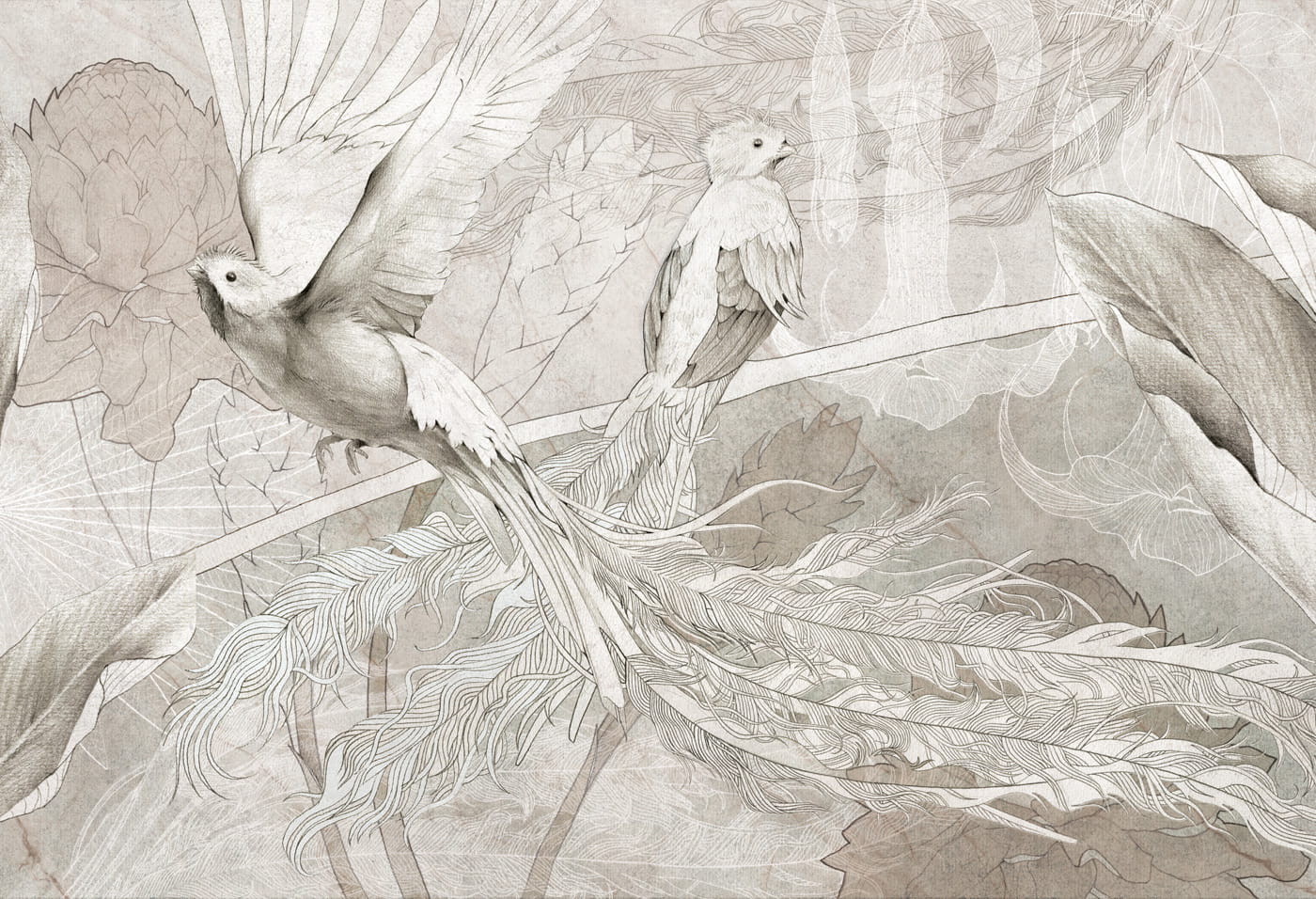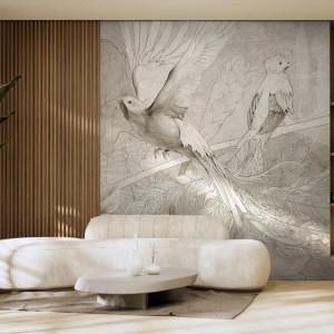 Tapeta Artystyczna Panama - Warm Grey - Nowoczesna Tapeta Do Salonu I Sypialni Z Egzotycznymi Ptakami