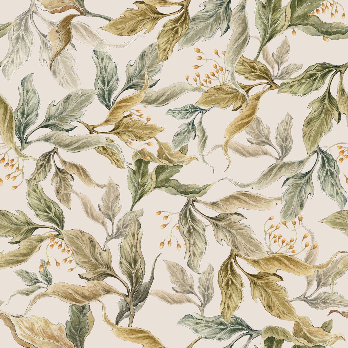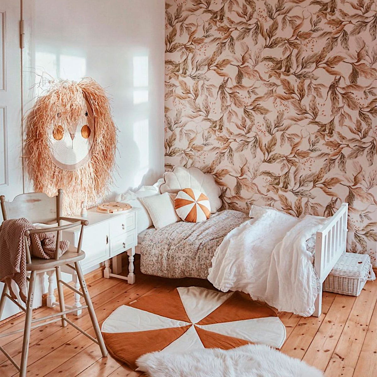 Plątanina liści – wzór Kasi Goraj-Stróżyńskiej – to bardziej harmonijnie, jednokolorowe działo, jednak sama kompozycja jest obfita. Liście są spore, mierzące od 15 do 30 cm, to piękny element w pokoju o delikatnym wystroju. Świetnie prezentuje się np. za baldachimem nad łóżeczkiem. Kiedy liście naprawdę wyglądają, jakby w głębi była magiczna kraina.