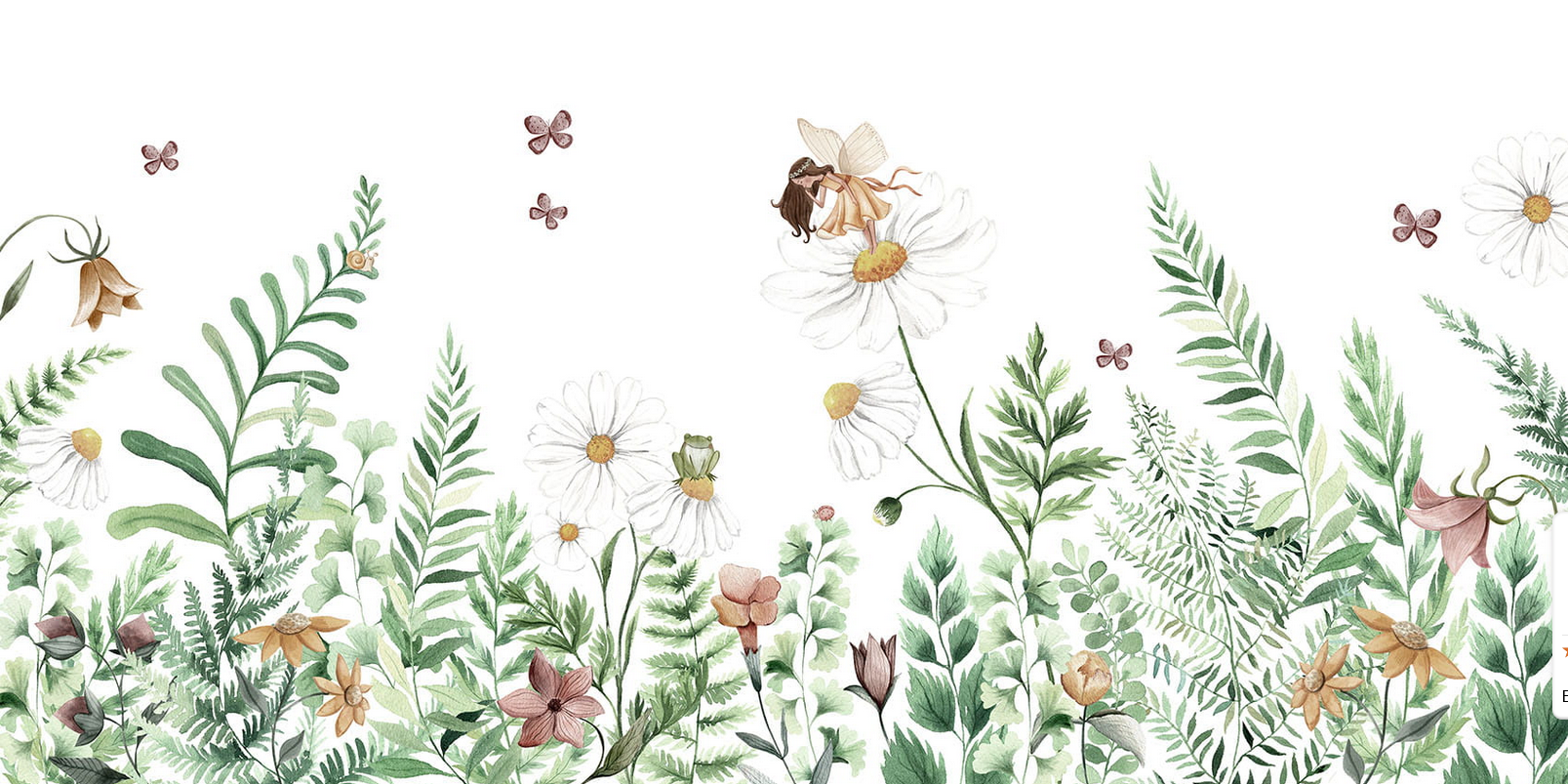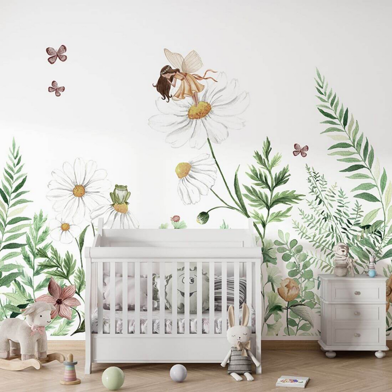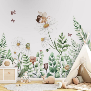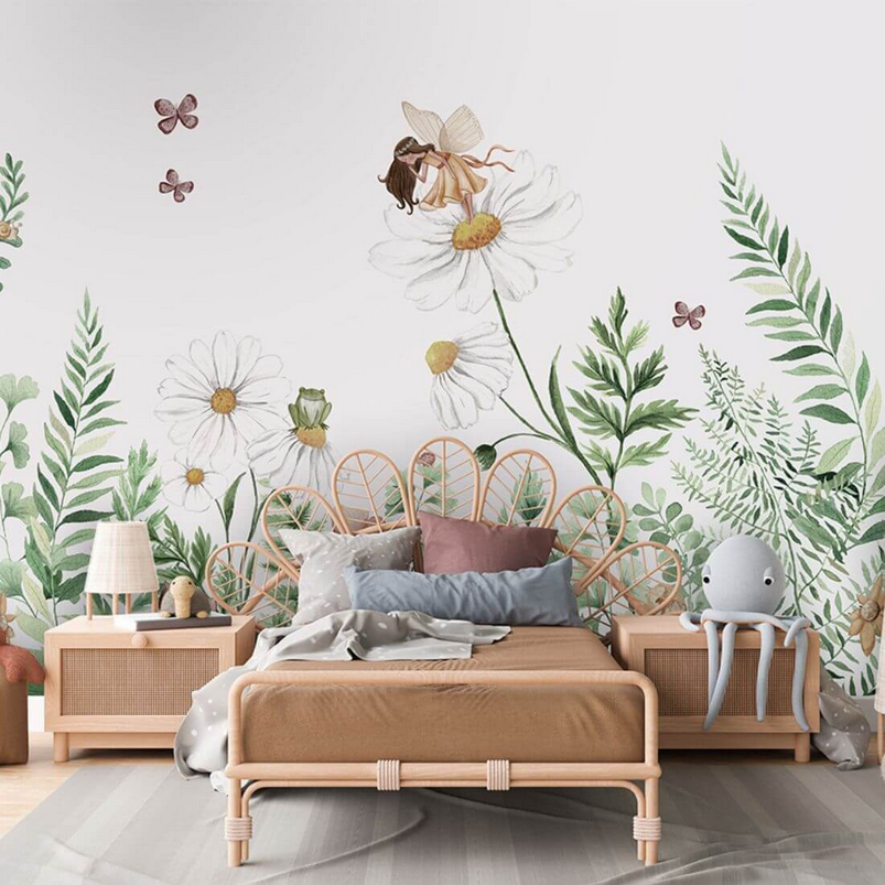 Tapeta „Fairy Garden” to baśniowa scena dziecka zanurzonego w świecie natury — łąka pełna białych stokrotek, motylków, ślimaków, żabek i drobnych stworzeń. Na jednym z kwiatów odwiedza dzieci niezwykła wróżka — subtelny i magiczny klimat.