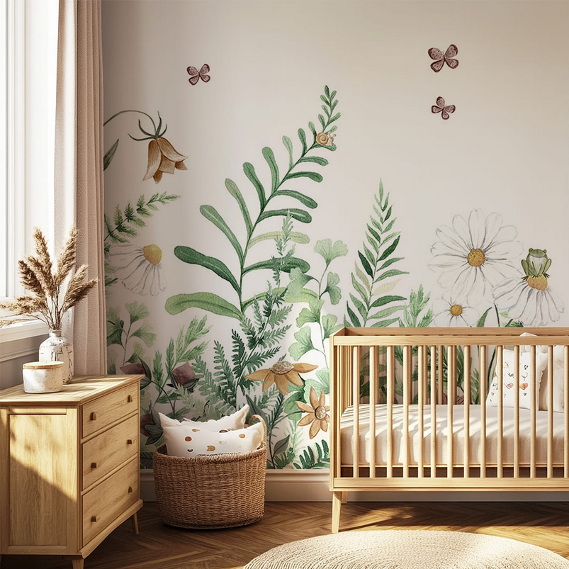 Tapeta przedstawia uroczą, pastelową łąkę z drobnymi kwiatami, motylkami, ślimakami i żabkami. W centrum kompozycji znajduje się malutka wróżka siedząca na stokrotce — to element, który nadaje całemu wzorowi marzycielski i spokojny klimat. Całość kompozycji oddaje atmosferę delikatnej przyrody i dziecięcej fantazji, idealnie wpisującą się w styl boho lub skandynawski.