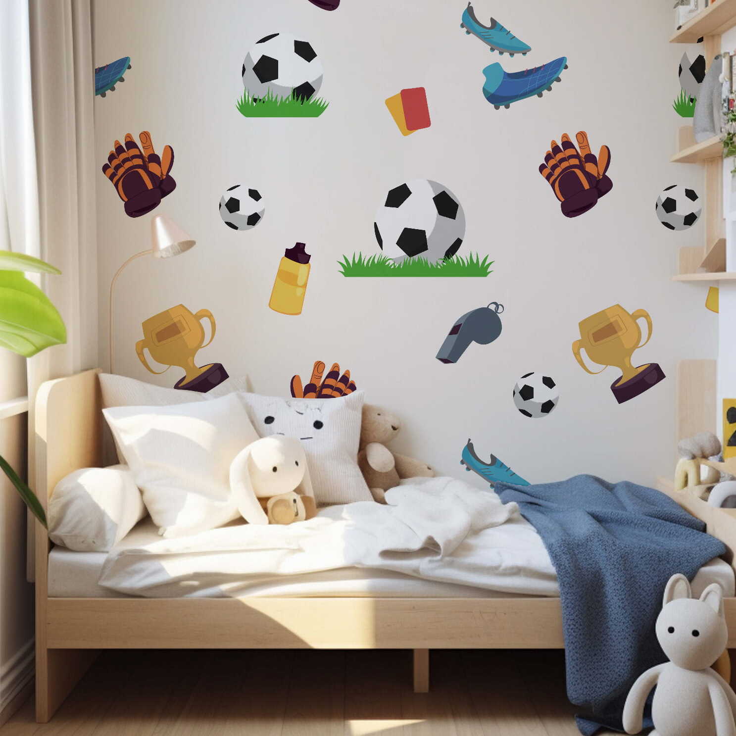 Energetyczne kolory: Wzór łączy intensywne kolory, takie jak zieleń boiska, biały i czarny piłki oraz akcenty w barwach drużyn, tworząc energiczny, sportowy klimat w pokoju dziecka.