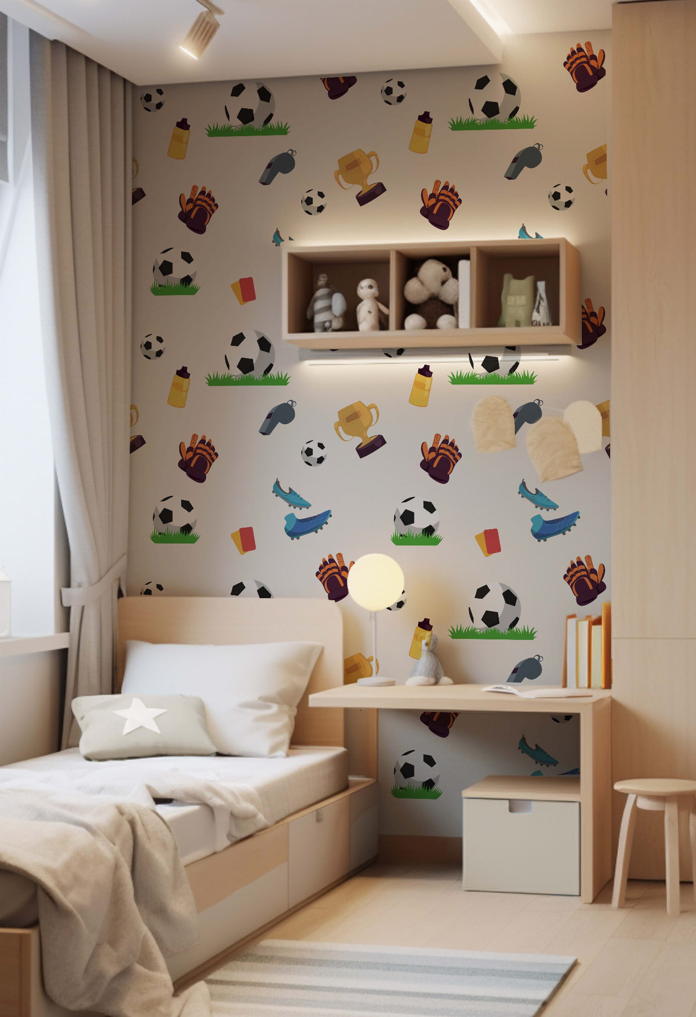 Piłkarska pasja na ścianie: Dzięki motywom piłkarskim tapeta Football Fana wprowadza atmosferę sportowych emocji, sprawiając, że pokój staje się miejscem, które inspiruje do aktywności fizycznej i kibicowania.