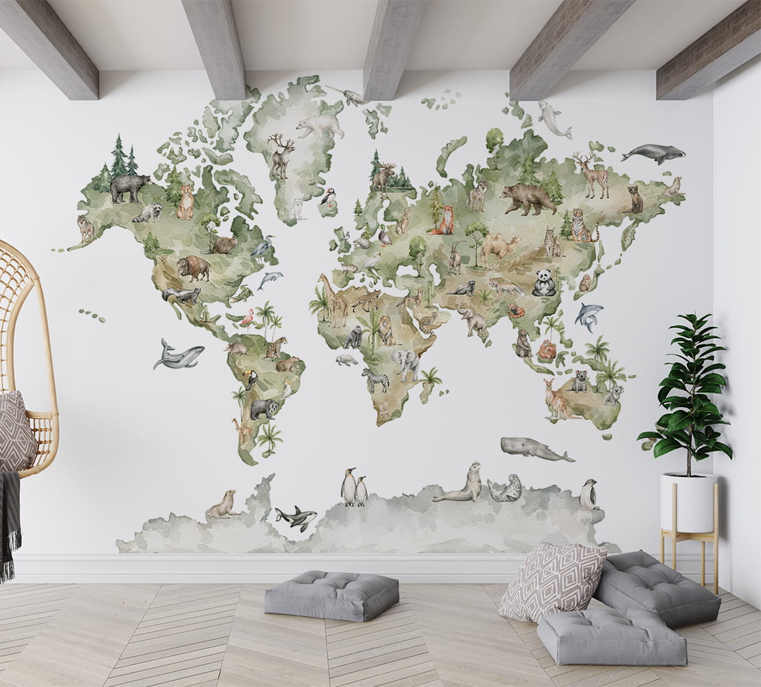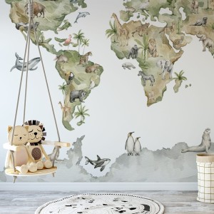 Tapeta do pokoju dziecka z mapą świata i zwierzętami to wyjątkowa dekoracja ścienna, która łączy estetykę z walorem edukacyjnym. Kolorowa mapa świata dla dzieci przedstawia zwierzęta charakterystyczne dla różnych kontynentów, zachęcając najmłodszych do poznawania przyrody, geografii i różnorodności świata już od pierwszych lat życia.