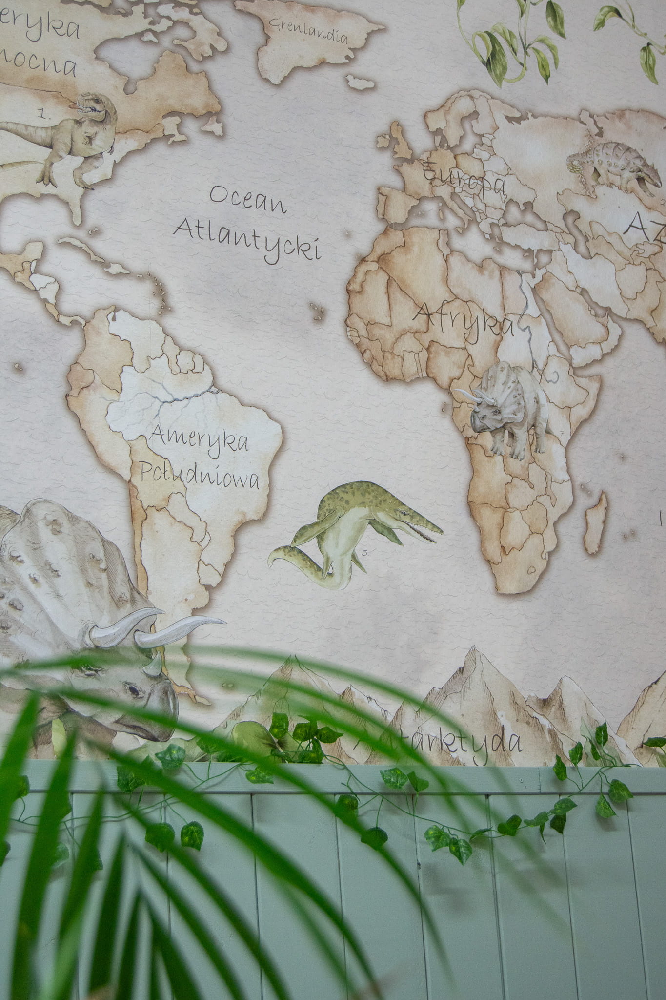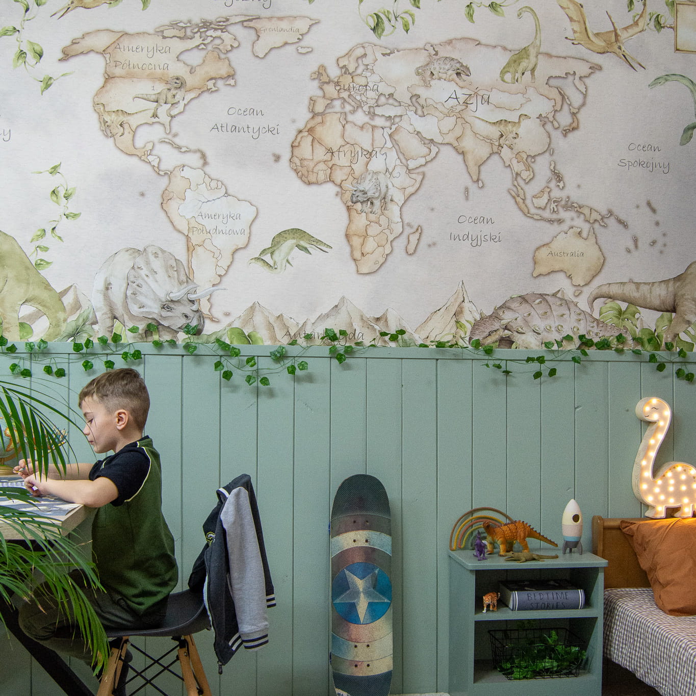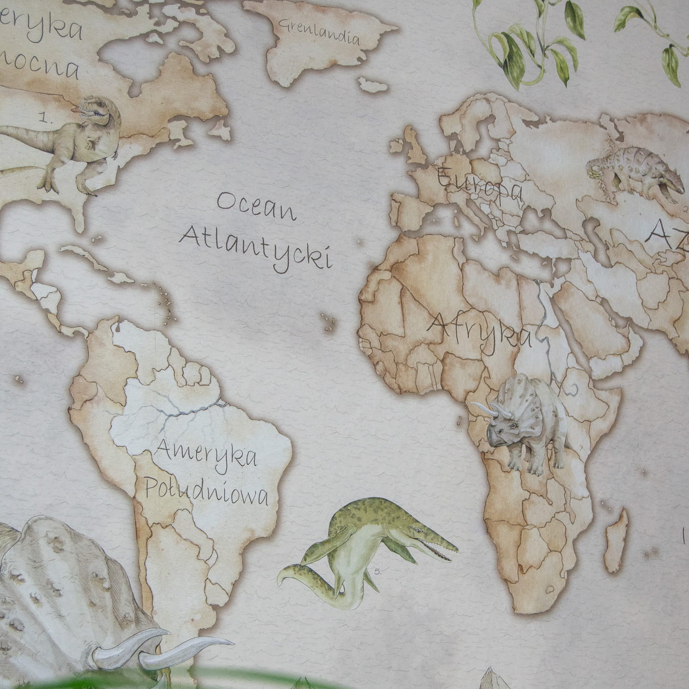 Dzięki tej dekoracji ściennej, dzieci będą mogły przenieść się w świat pełen tajemnic i niespodzianek, odkrywając różnorodność kultur, krajobrazów i przyrody naszej planety. Obecność dinozaurów na mapie dodaje uroku i fascynacji, pobudzając wyobraźnię i zachęcając do zgłębiania wiedzy o prehistorycznych stworzeniach.