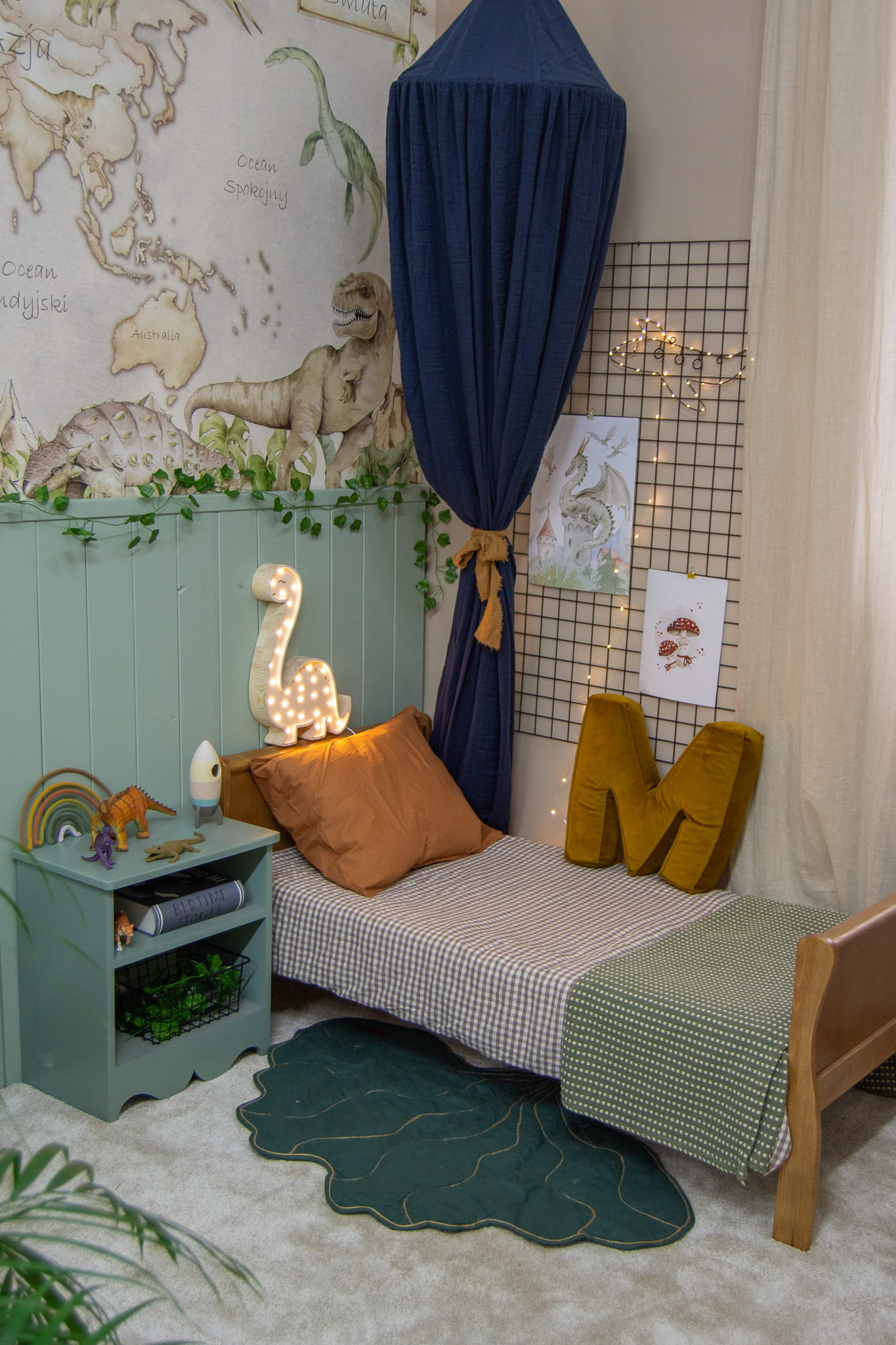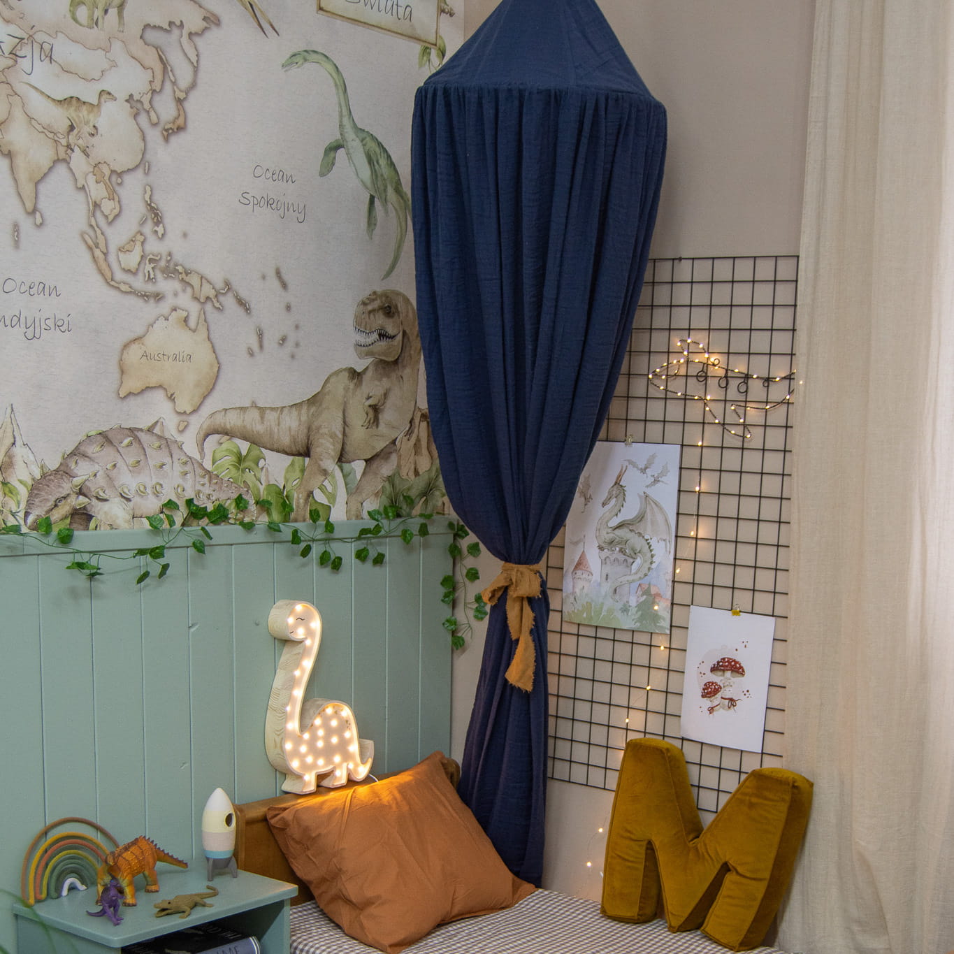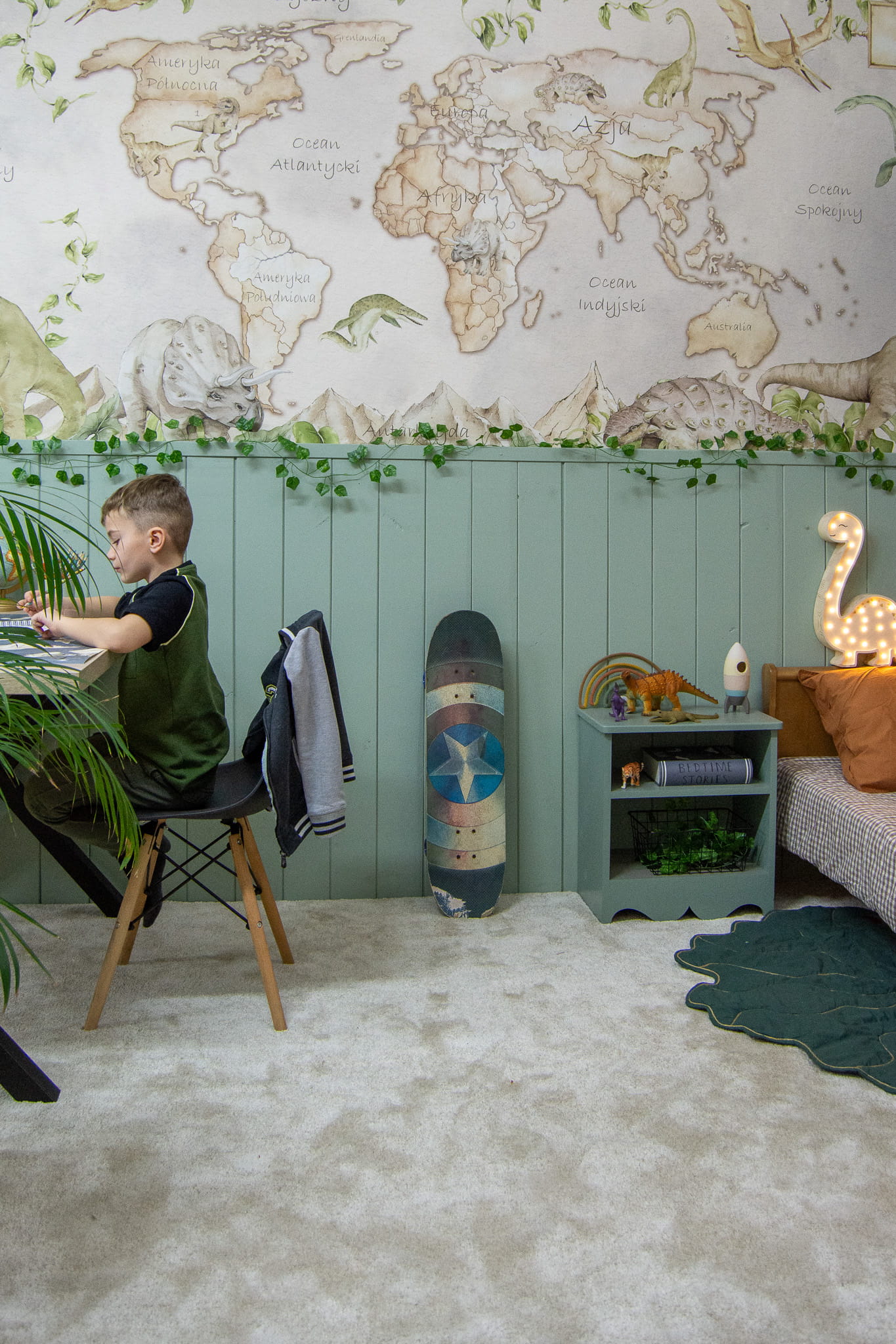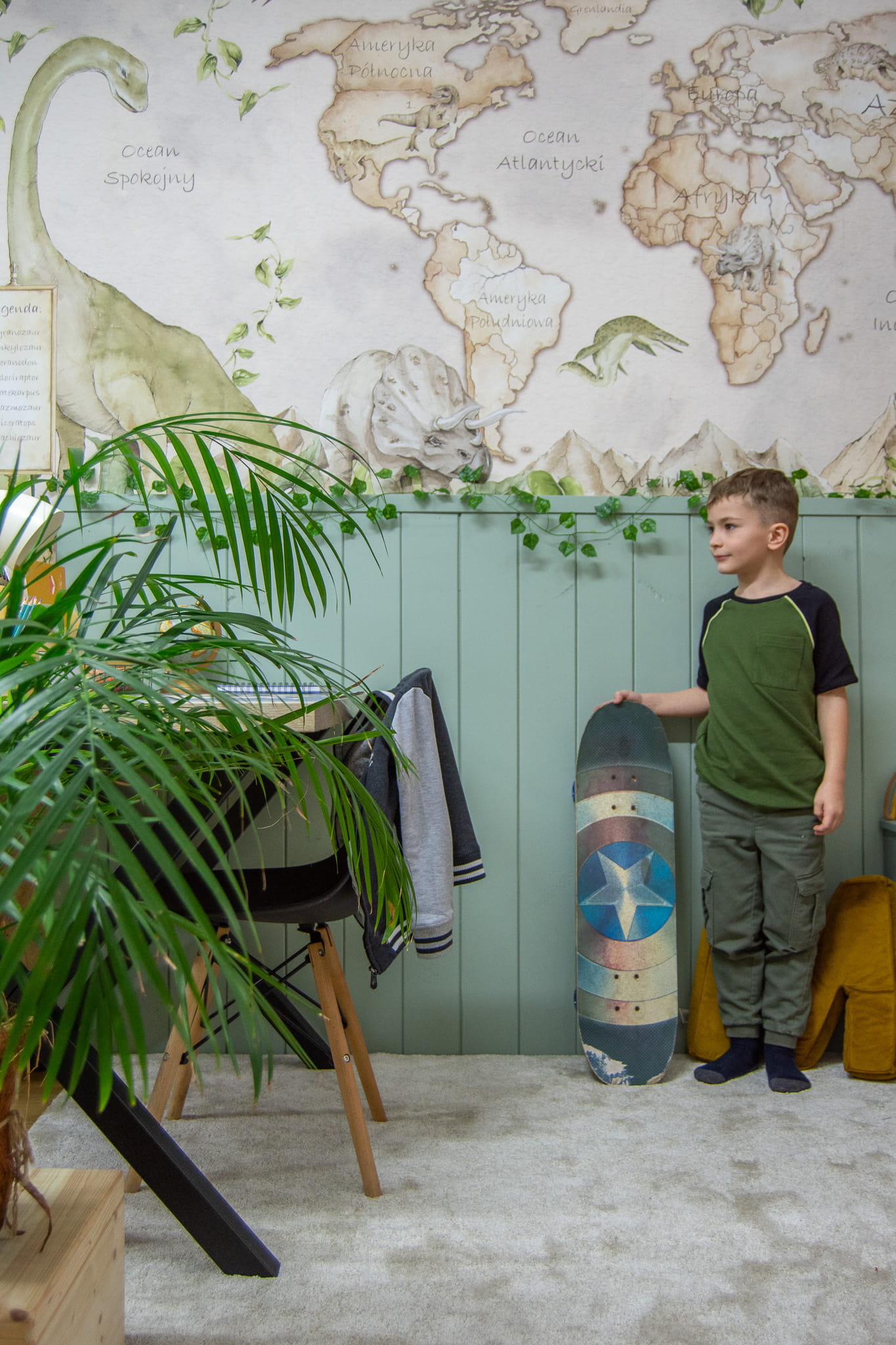 Dzięki tej dekoracji ściennej, dzieci będą mogły przenieść się w świat pełen tajemnic i niespodzianek, odkrywając różnorodność kultur, krajobrazów i przyrody naszej planety. Obecność dinozaurów na mapie dodaje uroku i fascynacji, pobudzając wyobraźnię i zachęcając do zgłębiania wiedzy o prehistorycznych stworzeniach.